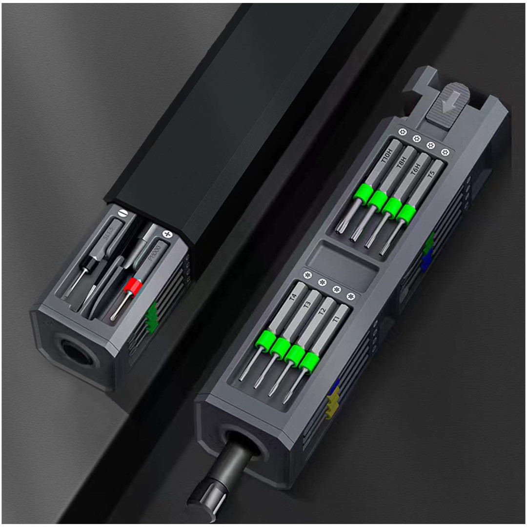 30dílná sada přesných šroubováků s 28 bity a dvěma doplňky. Pouzdro z oxidovaného hliníku (15 x 3,6 x 3,6 cm) lze personalizovat vyrytým logem. Kompaktní pouzdro usnadňuje uložení všeho na jednom místě. Ruční šroubovák je ideální pro opravu jakéhokoli malého zařízení a díky svému tvaru se snadno používá i ovládá. Je vybaven širokou škálou bitů, takže je univerzální pro mnoho typů kutilských činností. Každý typ bitu je označen jinou barvou, aby jej bylo možné snadno identifikovat. Bity jsou magneticky přitaženy ke šroubováku. Součástí sady je také pinzeta na vybírání drobných předmětů a páčidlo na zvedání a otevírání pouzder. Baleno v dárkové krabičce (17 × 55 × 43,5 cm) s magnetickým uzávěrem. Záruka 3 roky.