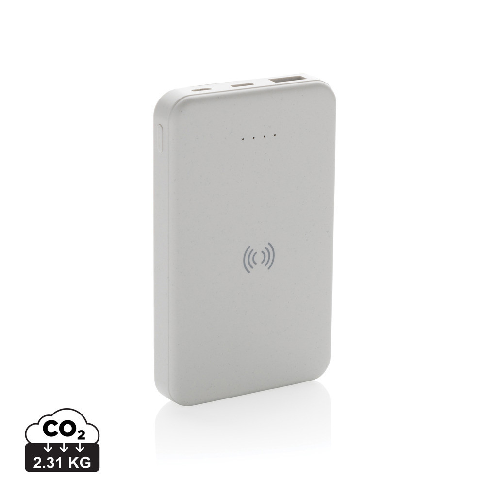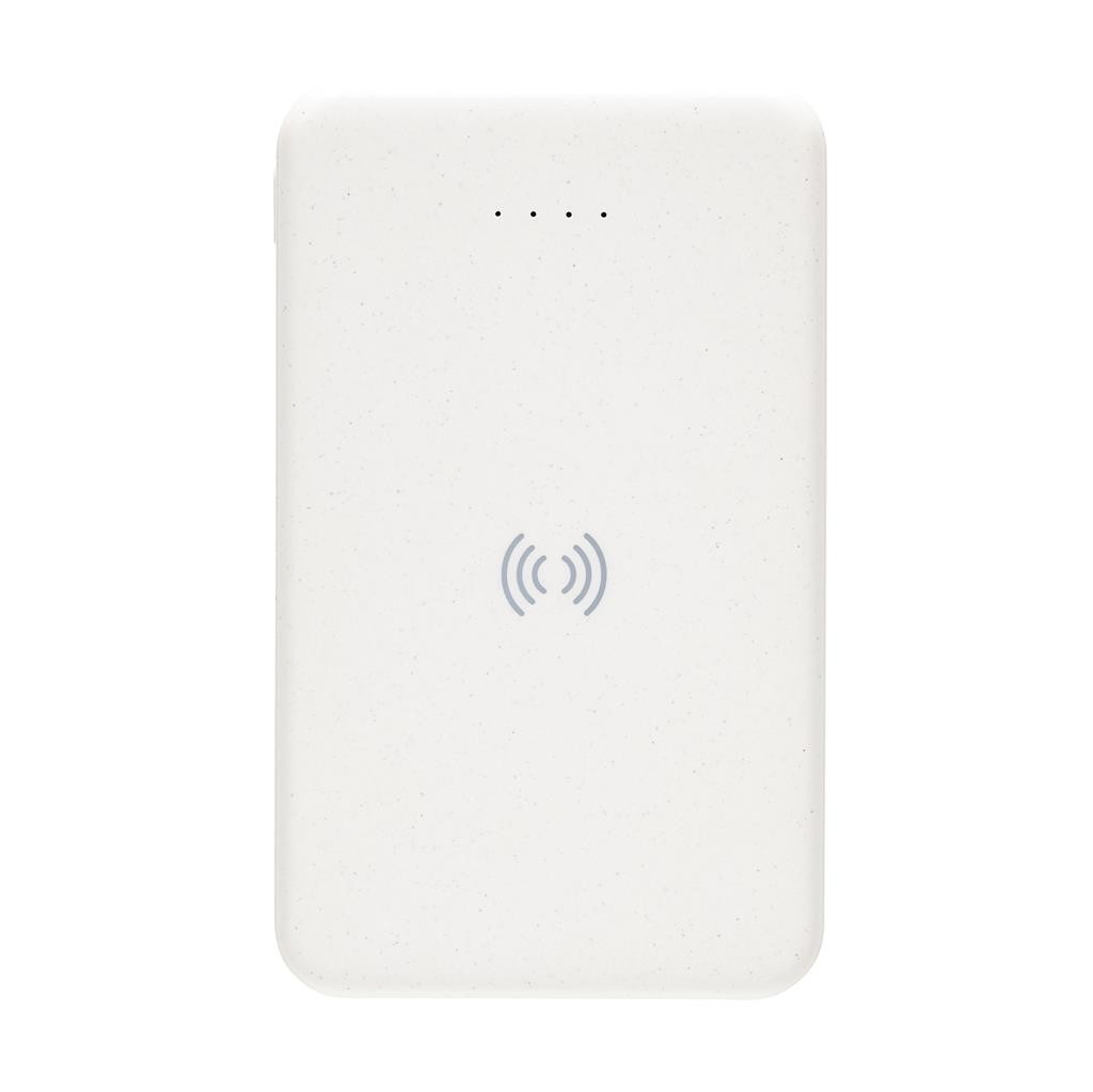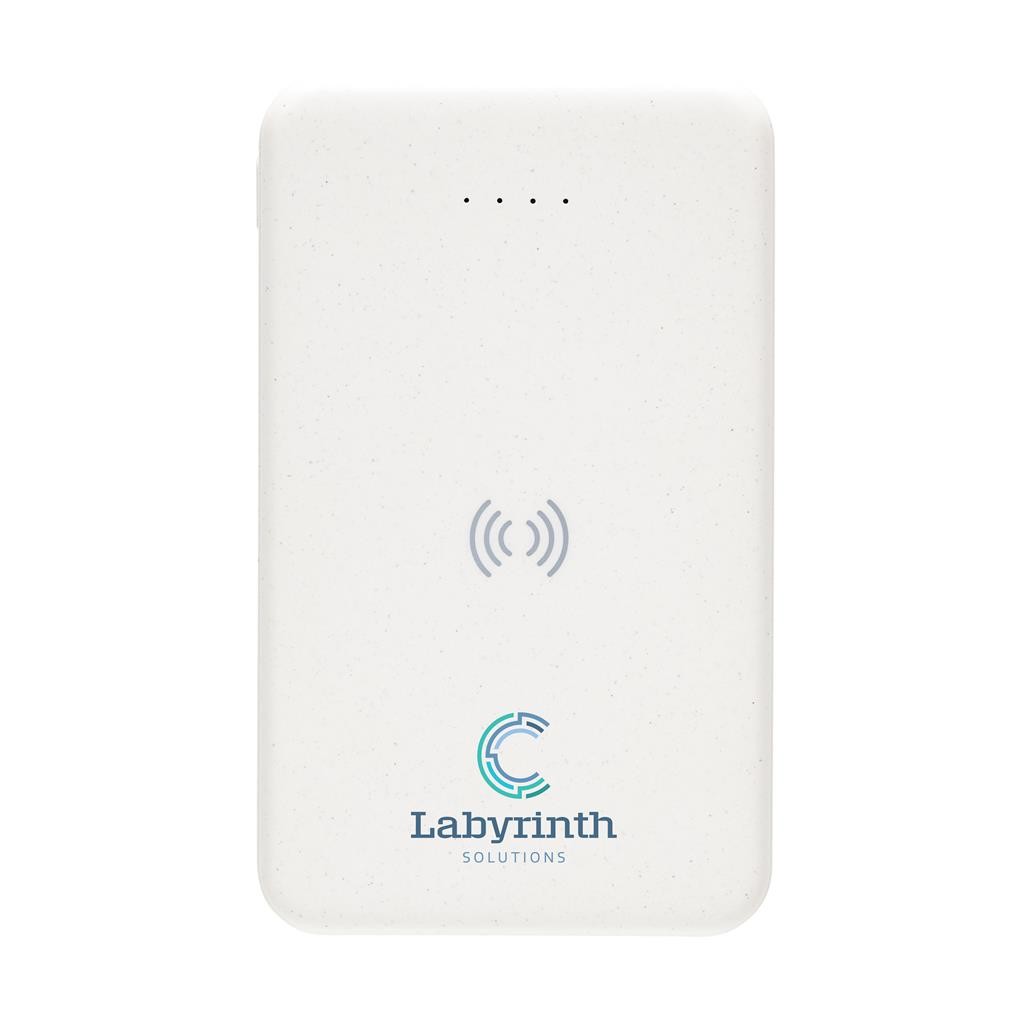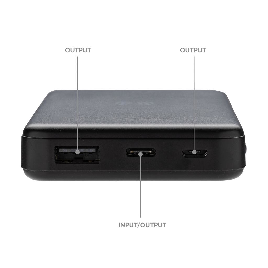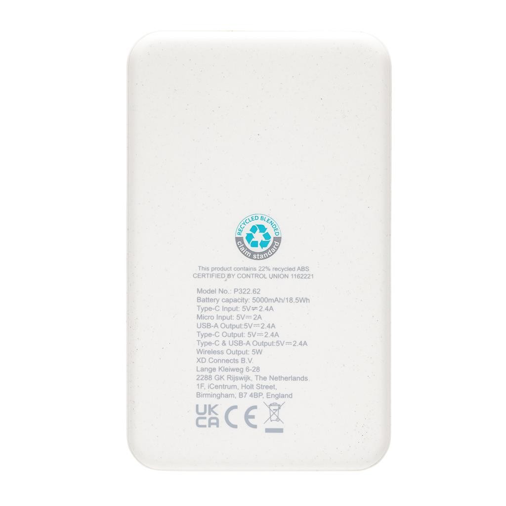 Bezdrátová 5W powerbanka s kapacitou 5 000 mAh vyrobená z recyklovaného ABS plastu s RCS certifikací. RCS (Recycled Claim Standard) je globální standard, který umožňuje ověřit použití recyklovaného materiálu v produktu napříč celým dodavatelským řetězcem. Celkový podíl recyklátu dle váhy produktu: 26 %. Kvalitní lithium polymerová baterie řady A s kapacitou 5 000 mAh plně nabije mobilní telefon až 2x. Světelné indikátory stupně nabití. Micro USB vstup: 5V/2A, USB C vstup: 5V/2,4A. USB A výstup: 5V/2,4A, USB C výstup: 5V/2A, bezdrátový výstup: 5W. Včetně nabíjecího kabelu z recyklovaného TPE. Výrobek je kompletně bez PVC. Baleno v FSC kraftové dárkové krabičce. 1 baterií typu Li-ion súčasťou balenia.