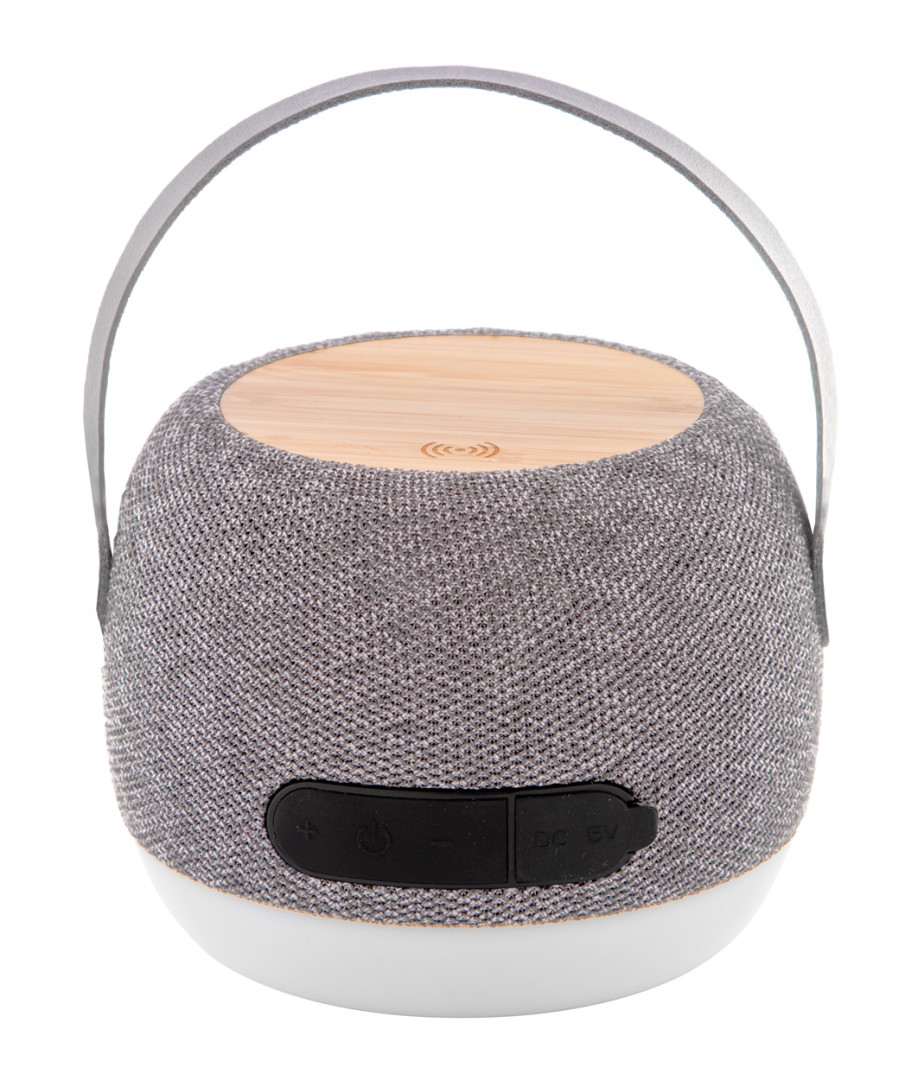 Bluetooth reproduktor v pouzdře z recyklovaného ABS potaženého látkou RPET s LED světlem ve spodní části a bezdrátovou rychlonabíječkou z bambusové desky (15W) nahoře. S popruhem na přenášení z PU kůže, funkcí hands-free volání a vestavěnou dobíjecí baterií (1200 mAh). Včetně USB nabíjecího kabelu.
