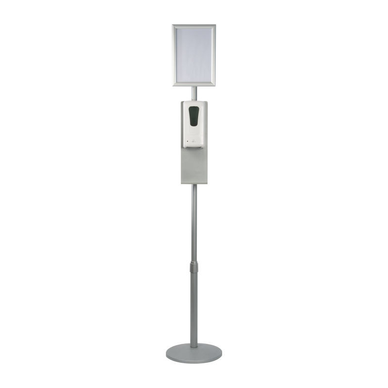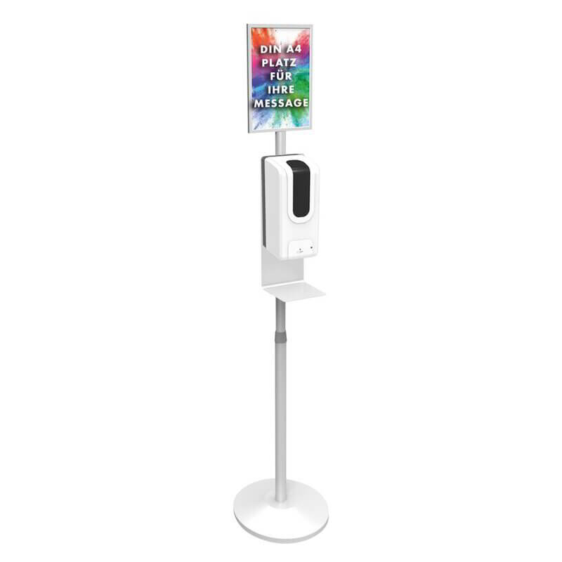 Stabilní dezinfekční stojan s nastavitelnou výškou (125-165cm), plocha pro reklamu DIN A4, objem nádrže pro dezinfekční gel nebo tekutinu: 1l. Váš reklamní odkaz můžete kdykoliv vytisknout ve formátu A4 a vyměnit na stojanu. Funguje s připojením pomocí DC adaptéru (6V / 1A) nebo 4 baterie 1,5V-ové typu C, ani jedno z uvedených není součástí balení. Způsob potisku pryskyřičná nálepka.
