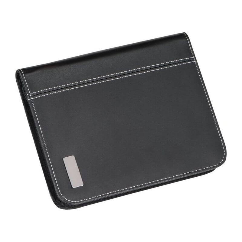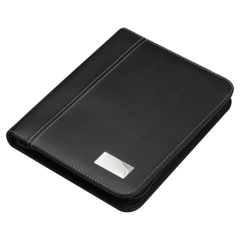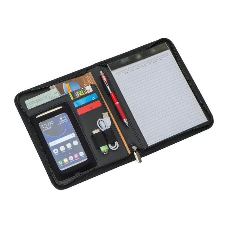 Konferenční složka ve velikosti A5 z vysokokvalitní lepené kůže s různými přihrádkami, poutkem na pero, držákem na smartphone a 30 stranovým linkovaný poznámkovým blokem s předtištěným kalendářem. Způsob potisku gravírování.