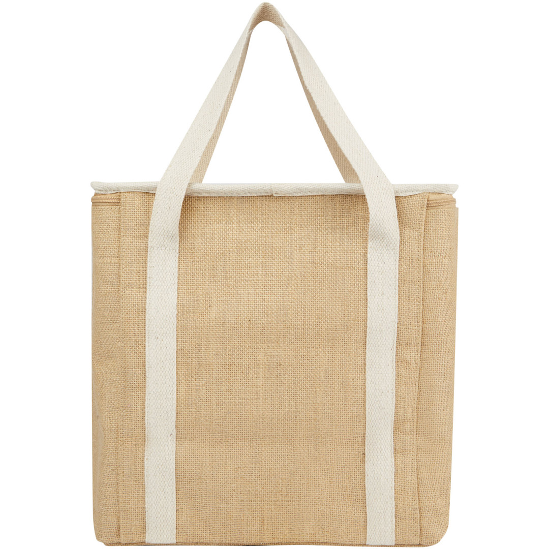 Velká chladicí taška Juta je vyrobena z pevné laminované juty odolné proti opotřebení. Disponuje velkou (19litrovou) hlavní přihrádkou, do které se vejde šest 1,5litrových lahví, a je vyložená extra silnou a potravinově nezávadnou hliníkovou izolací, která udrží nápoje, potraviny a občerstvení chladné, suché a chráněné po celé hodiny. Taška má horní zapínání na zip, přední kapsu a 2 bavlněná tkaná ucha na přenášení (50 x 2,5 cm). Vyrobeno v Indii a certifikováno OEKO-TEX®.
