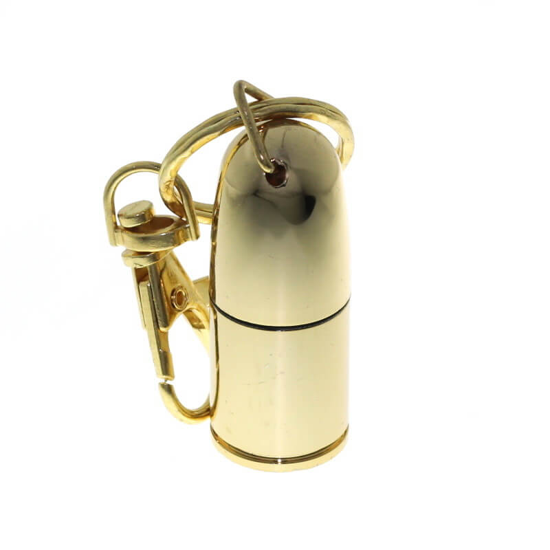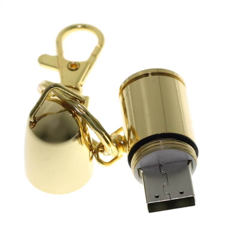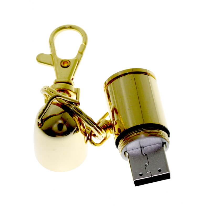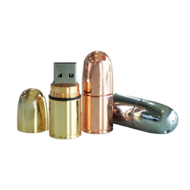 Mini kovový USB flash disk ve tvaru pistolového náboje. Vhodný pro tampon tisk, nebo laser loga. Možno připojit karabinku, kroužek, či šňůrku.