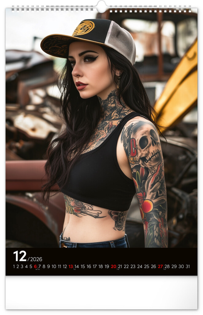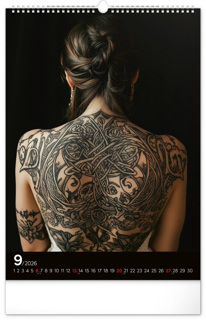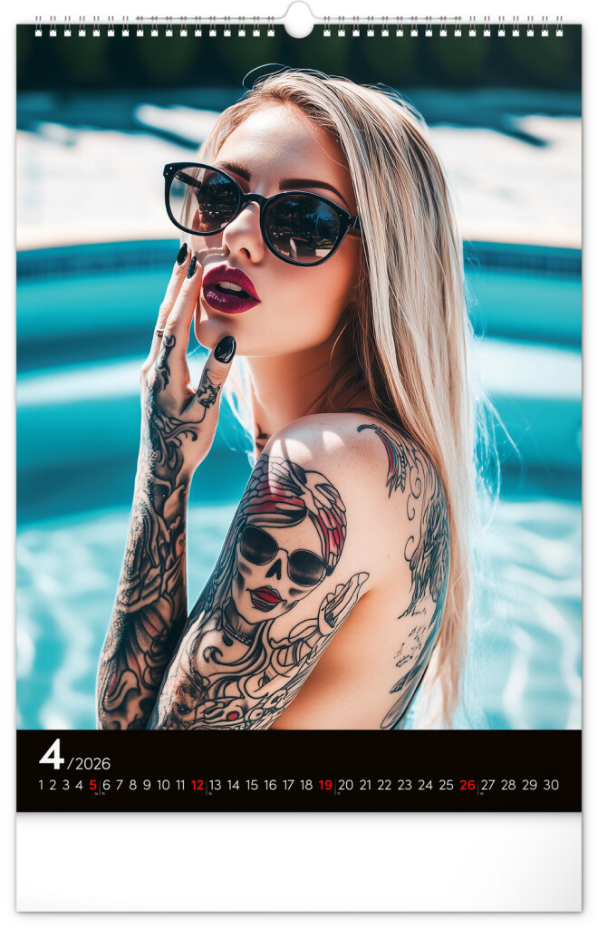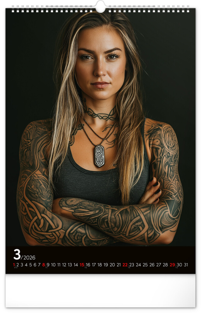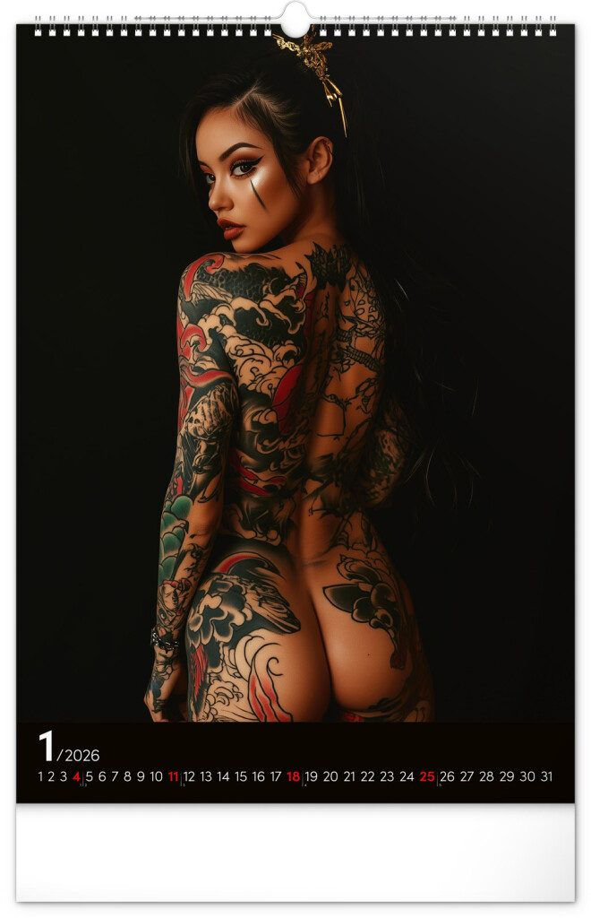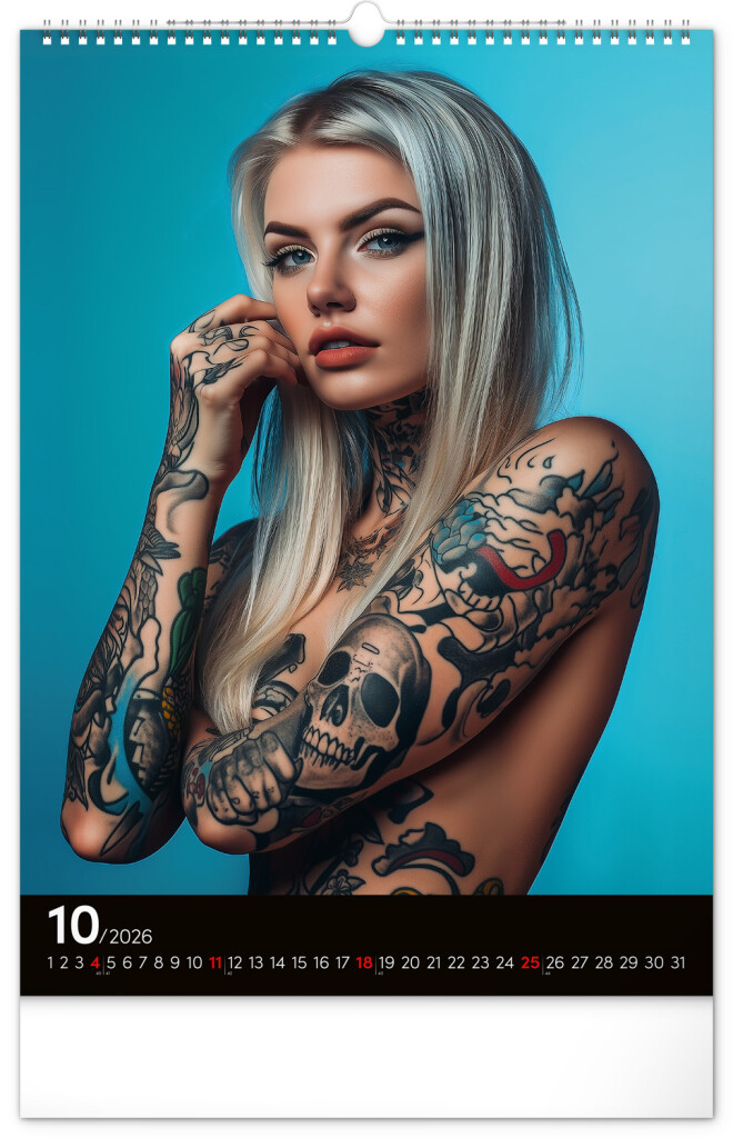 Rok plný charismatických žen a působivých tetování. Kalendář nabízí dvanáct fotografií modelek, které spojuje krása, styl a tělo proměněné v umělecké dílo. Nechybí jednoduché kalendářium se zvýrazněnými nedělemi na černém pozadí.