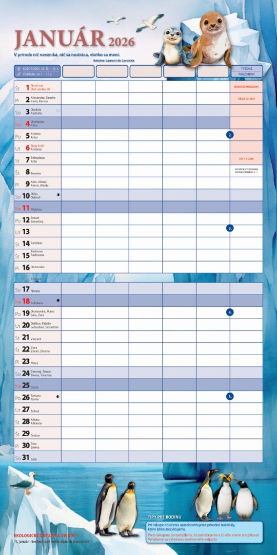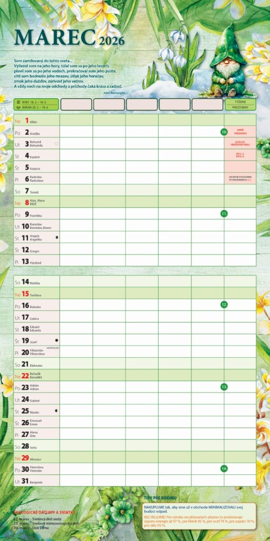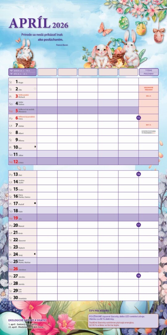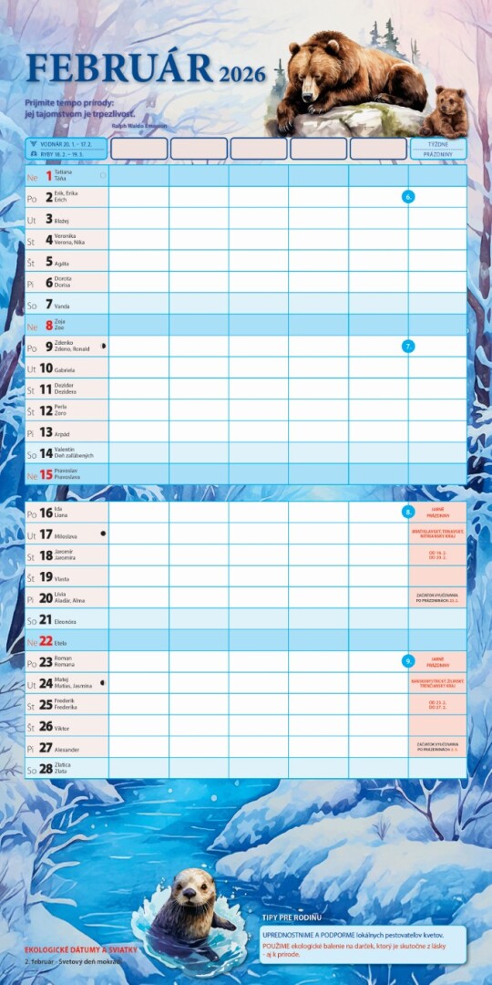 Tento praktický kalendář nabízí spoustu místa na zapisování aktivit celé domácnosti - každý člen si najde svou kolonku! Každý měsíc je navíc doplněn krásnými ilustracemi, inspirativními tématy, ekologicky šetrnými daty a svátky, tipy pro rodinu a prázdninovými informacemi. Součástí jsou také samolepky s emotikony a piktogramy, kterými můžete snadno vyjádřit své aktivity, pocity a emoce - hravě a srozumitelně. Součástí kalendáře je také propiska. Ideální pomocník pro organizovanou, ekologicky smýšlející a hravou domácnost! Doporučujeme jako dárek společně s Rodinným stolním kalendářem S26-26.