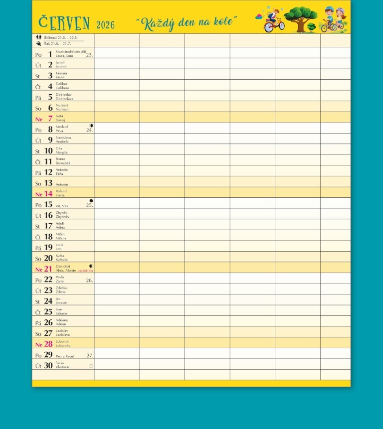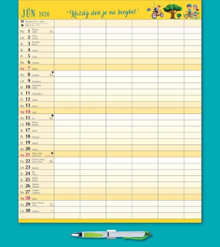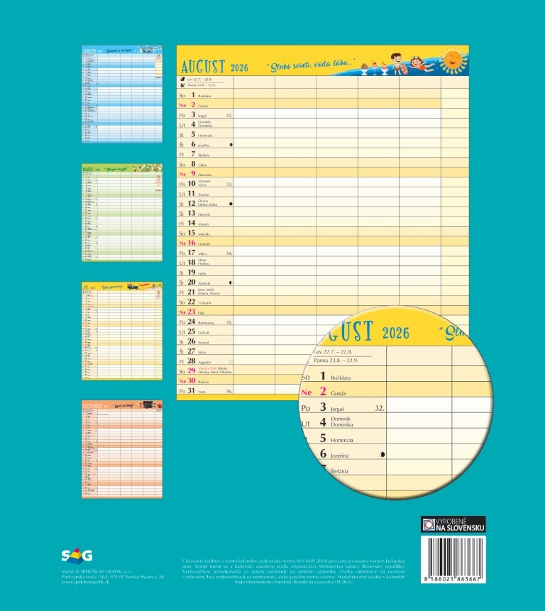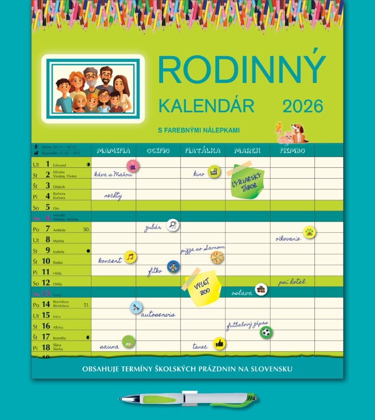 Tento praktický kalendář nabízí dostatek místa pro zapisování aktivit celé domácnosti - každý člen si najde svůj sloupec! Každý měsíc je navíc doplněn ilustracemi, motty. Součástí jsou také samolepky s emotikony a piktogramy, které usnadňují vyjádření aktivit, pocitů a emocí - hravě a přehledně. Součástí kalendáře je také propiska. Ideální pomocník pro organizovanou a hravou domácnost! Doporučujeme jako dárek společně s Rodinným stolním kalendářem S26-26.