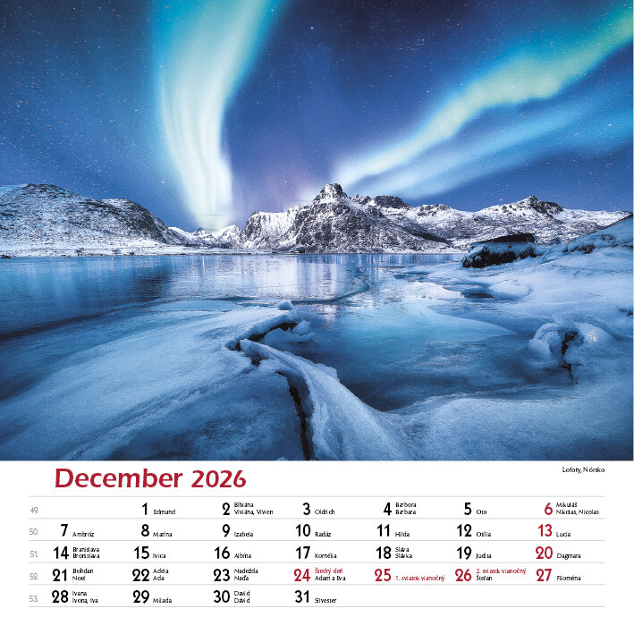 Kalendář Svět ticha zachycuje kouzelné okamžiky z přírody: majestátní velryby v hlubinách oceánu, zamrzlé krajiny a tichá zákoutí, kde vládne jen příroda a klid. Ideální dárek pro každého, kdo hledá inspiraci a klid v nádherných přírodních scenériích.