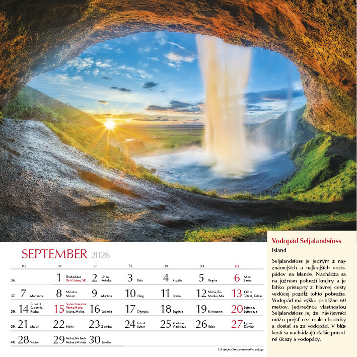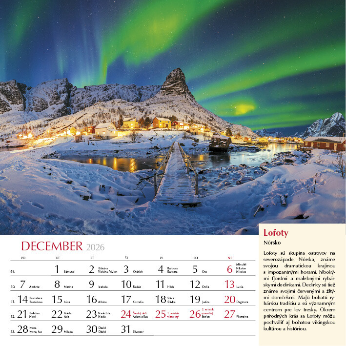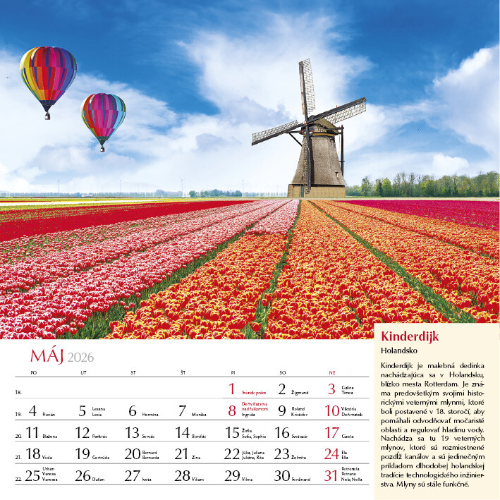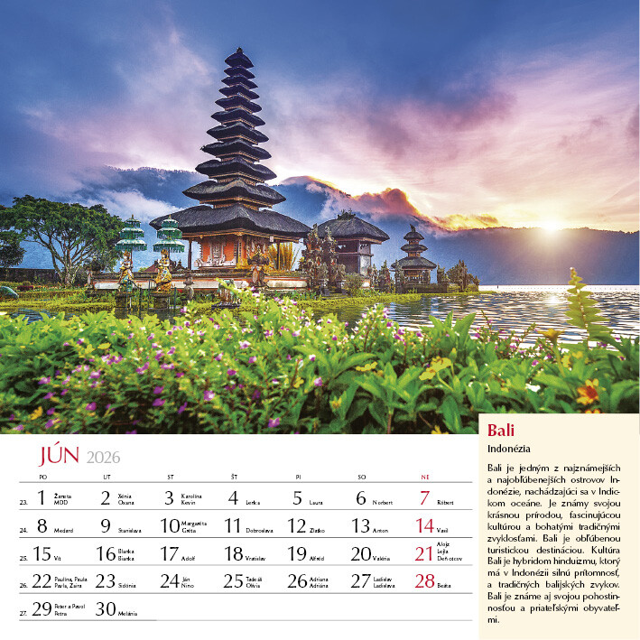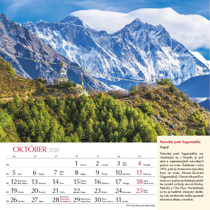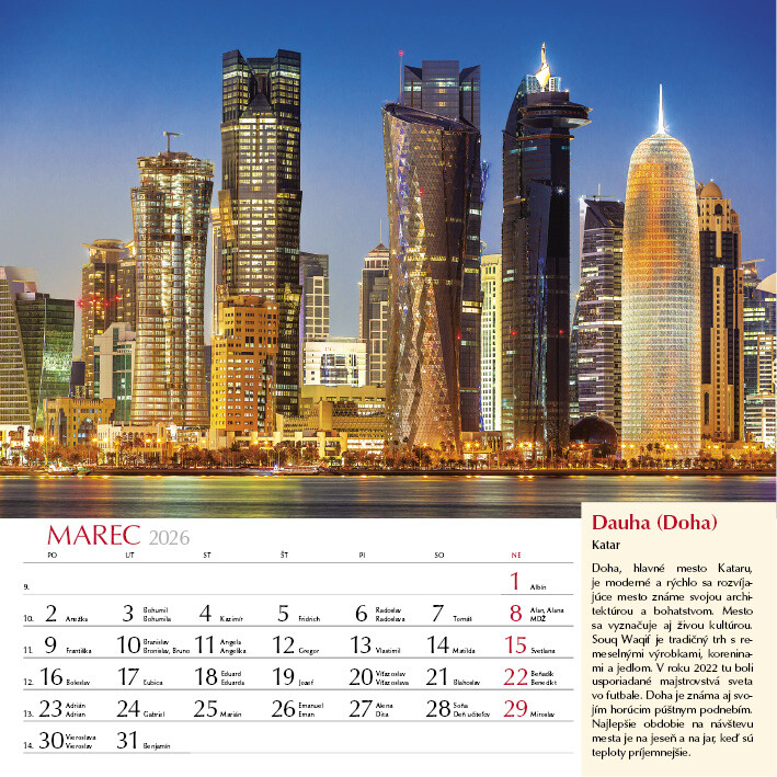 Procestujte svět prostřednictvím 12 výjimečných snímků z různých částí planety. Zachycuje rozmanitost kultur, přírody a architektury, od moderní nádhery Kataru přes ledovou krajinu Grónska, barevná tulipánová pole Nizozemska, chrámy Indonésie, dramatické vodopády Islandu až po horské ticho Nepálu pod Himálajem. Každý měsíc je doplněn krátkým popisem daného místa, takže se můžete nejen kochat pohledem, ale také se dozvědět něco nového o světě kolem nás. Ideální pro cestovatele, milovníky přírody a všechny, kteří rádi objevují krásy planety Země.