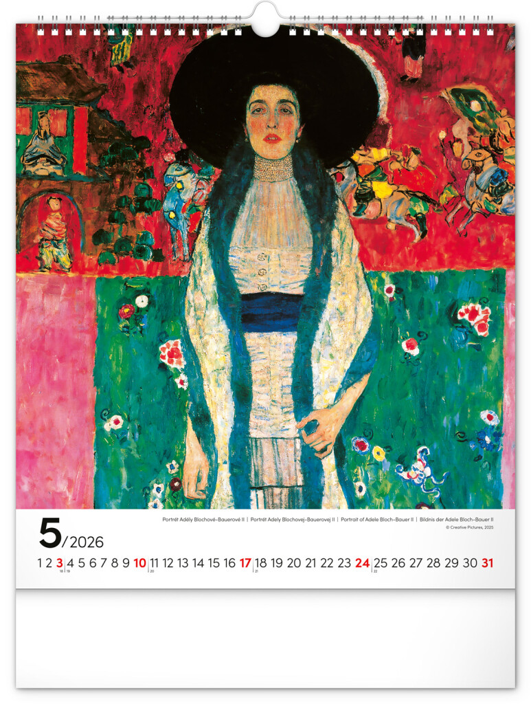 Na stránkách kalendáře obdélníkového formátu najdete Klimtovy obrazy žen vytištěné na kvalitním papíře s vysokou gramáží. Součástí kalendáře je univerzální kalendárium a popisky ve čtyřech jazycích.