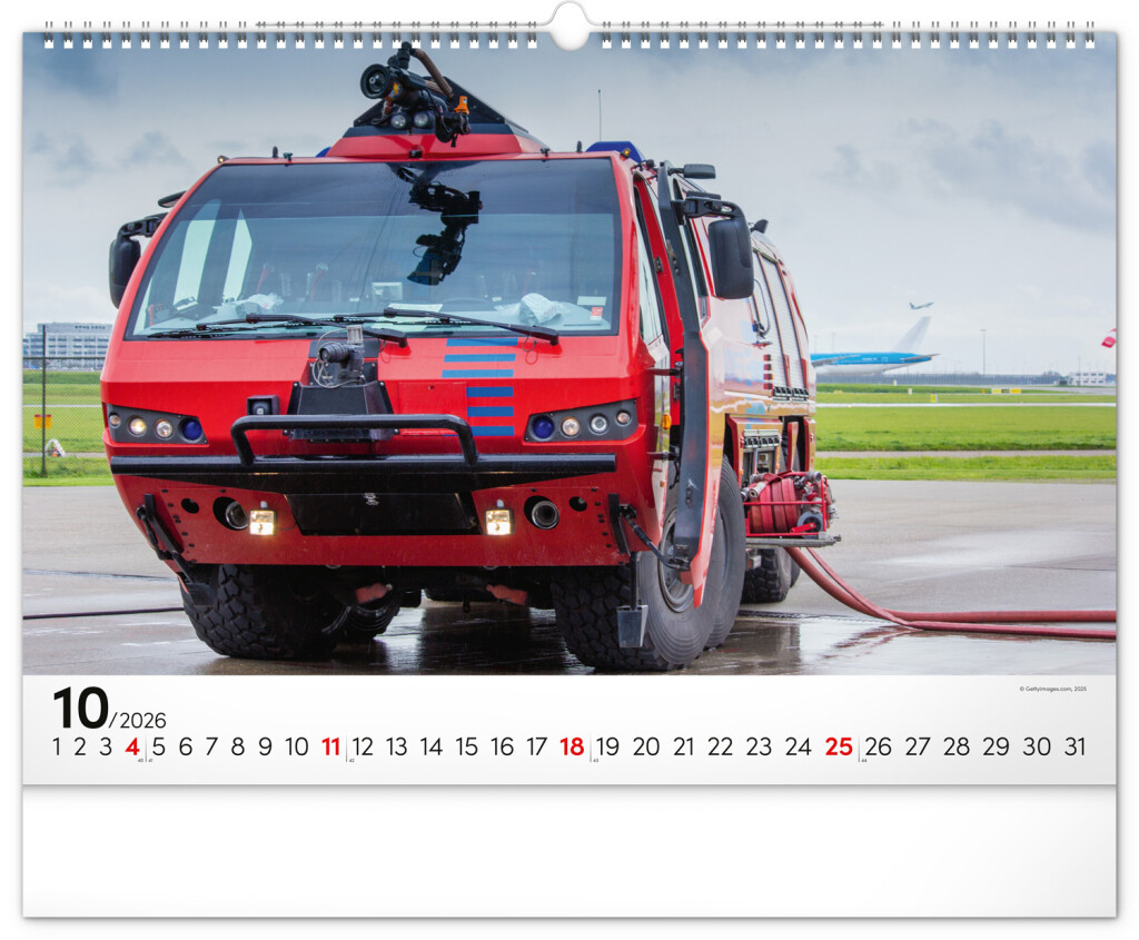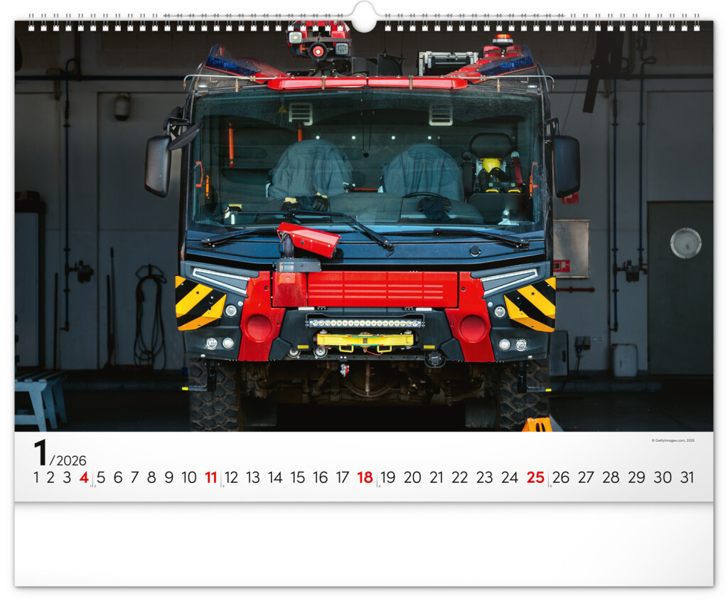 Nástěnný kalendář pro všechny fanoušky hasičských aut. Dvanáct obrázků hasičské techniky na stránkách kalendáře ve formátu na šířku. Fotografie jsou doplněny univerzálním kalendáriem na černém pozadí.