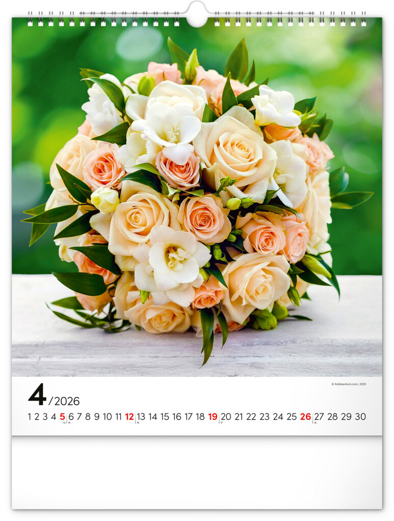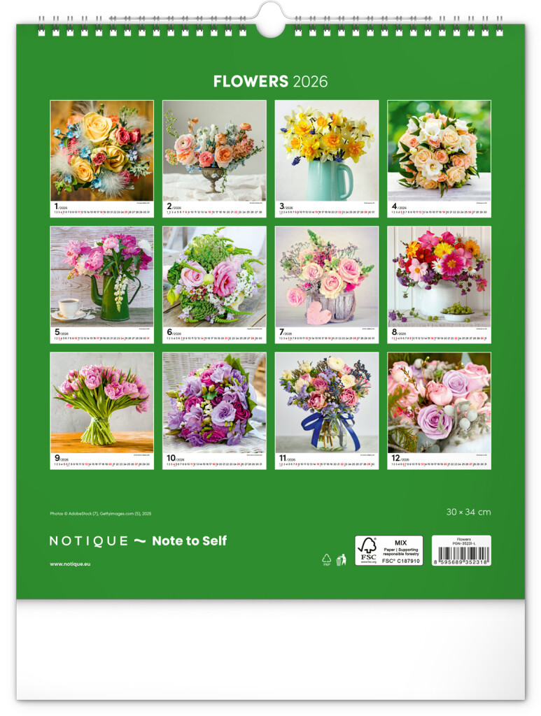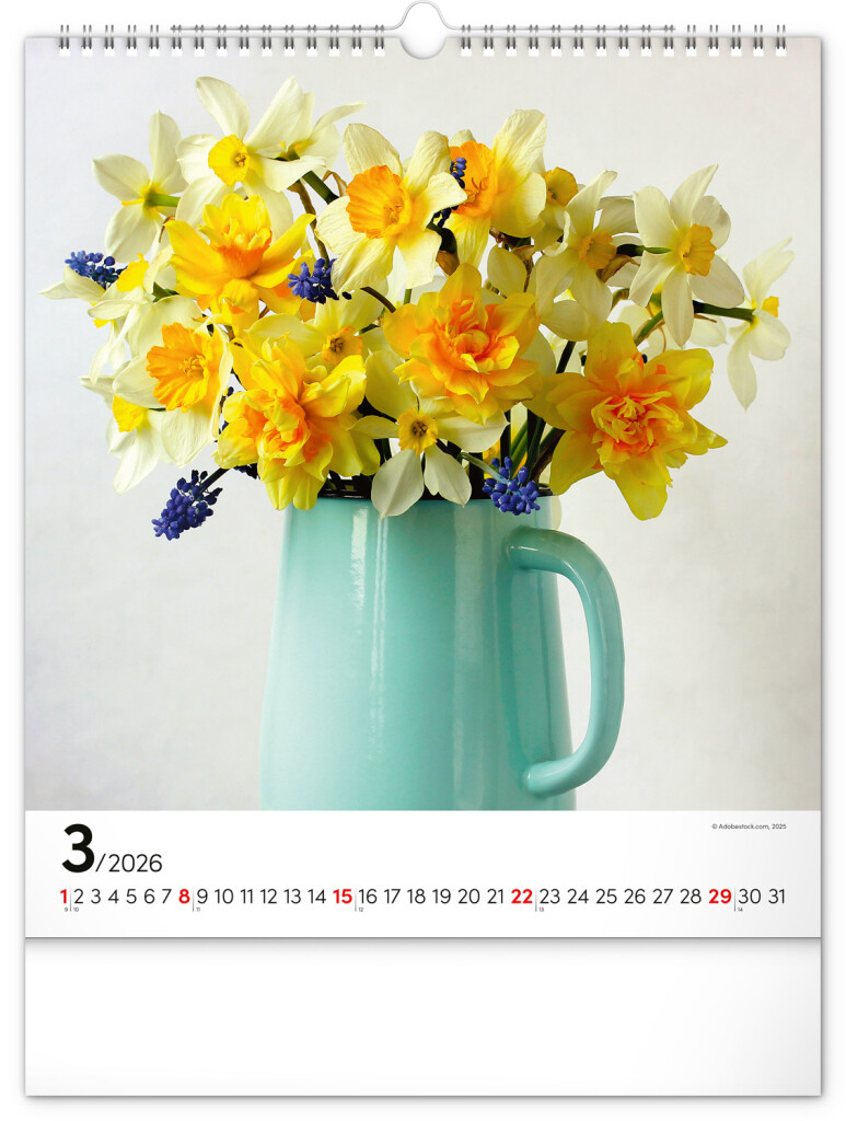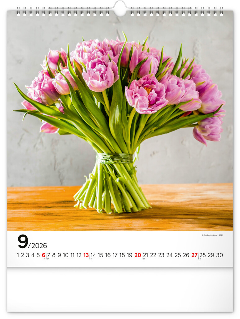 Fotografie pestrobarevných květin a originální vazby v nástěnném kalendáři s portréty. Fotografie doplňuje univerzální kalendárium na bílém pozadí.