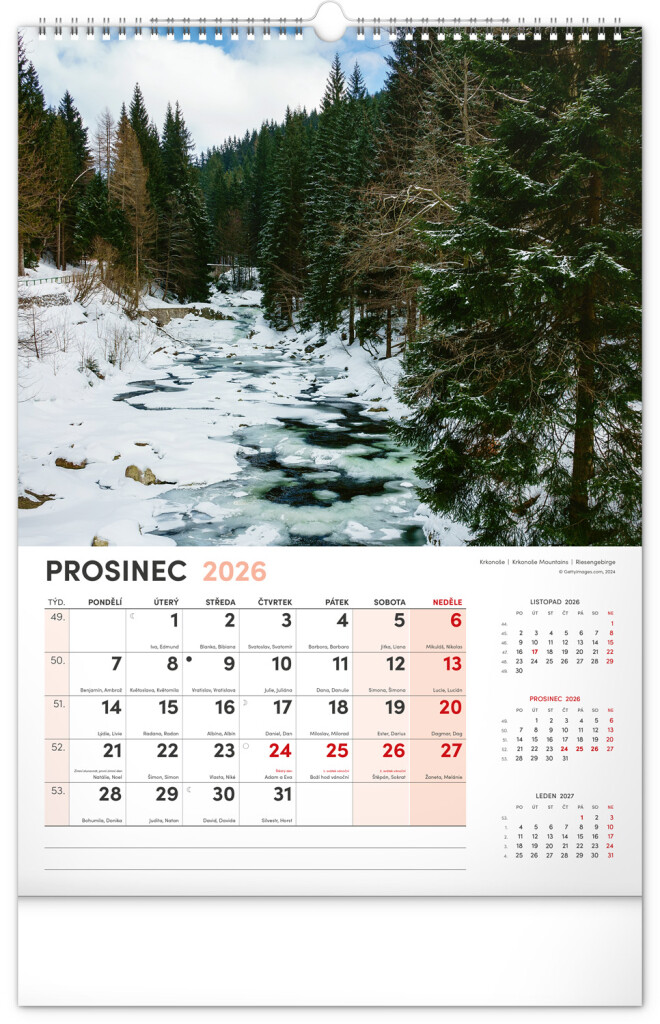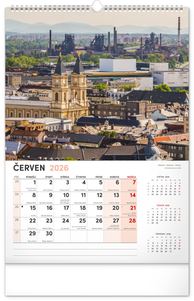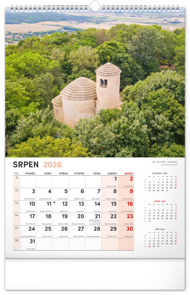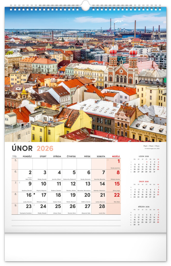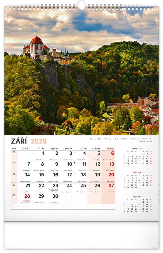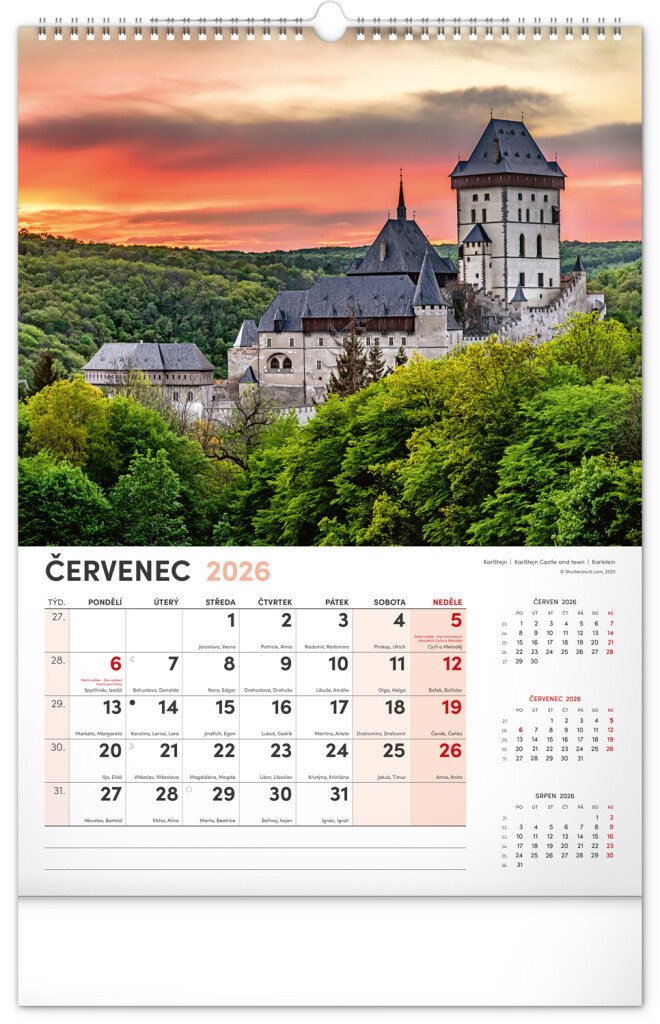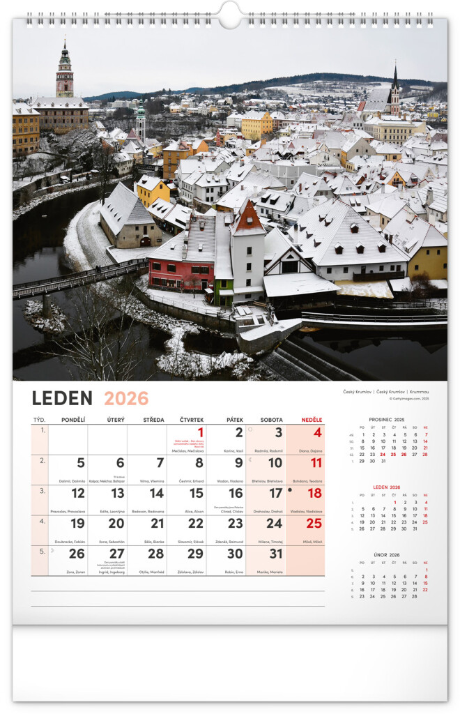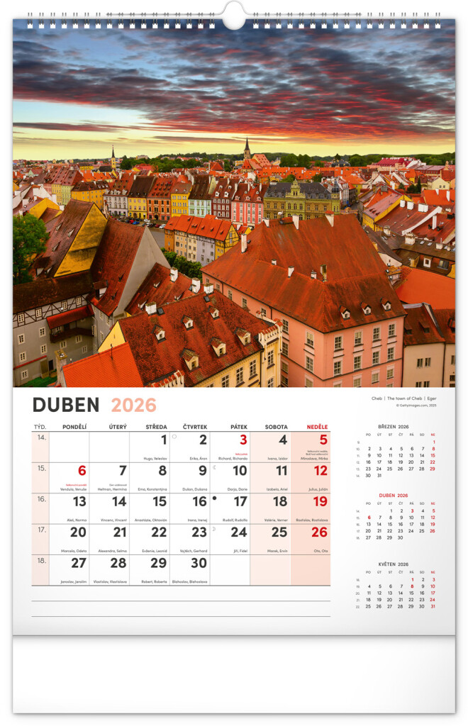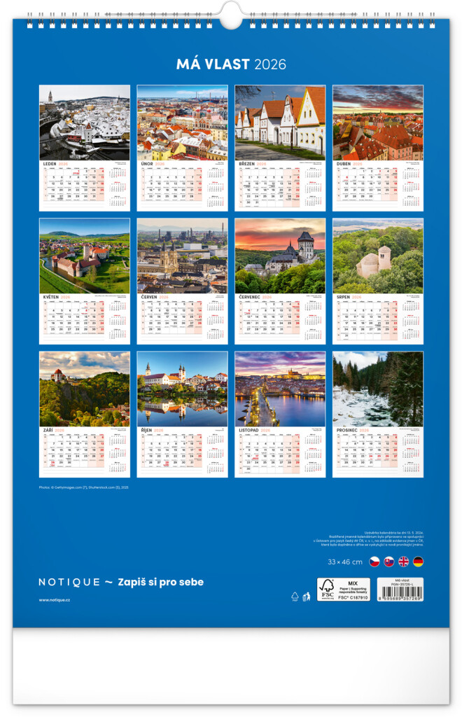 Kalendář s fotografiemi nejkrásnějších měst České republiky. Praha, Kutná Hora, Olomouc a další skvosty v kalendáři s tématem Má vlast ve formátu na výšku se jmenovkami a jednoduchým kalendáriem.