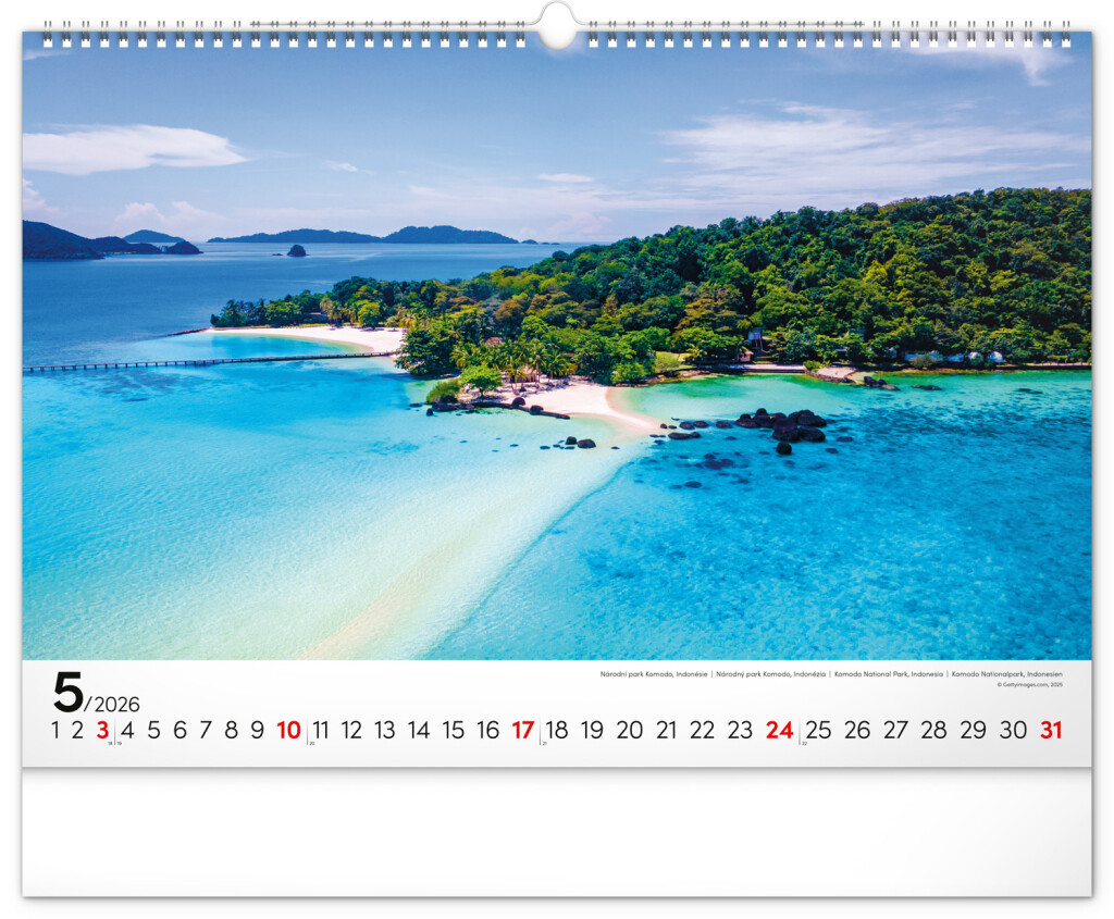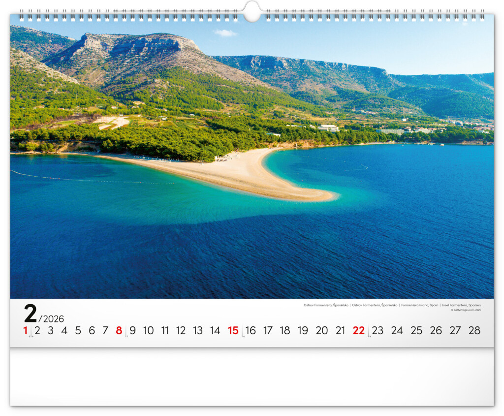 Průzračné tyrkysové vody, azurové nebe s bílými mraky, palmy, sluneční paprsky, to je skutečný ráj na zemi. Dvanáct plážových snímků z Portugalska, Thajska a dalších světových destinací na velkolepém bílém pozadí s jednoduchým kalendáriem.
