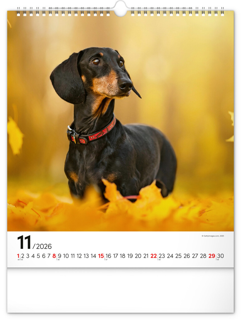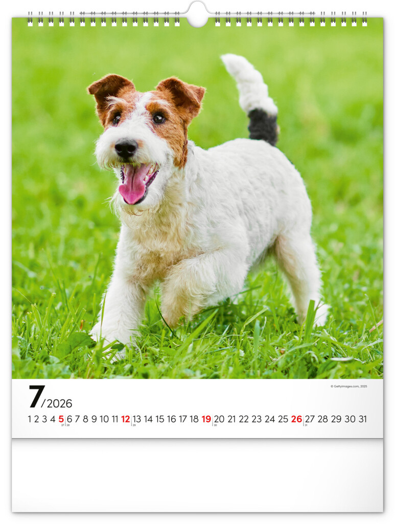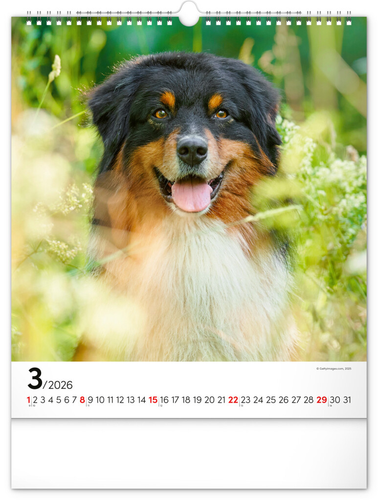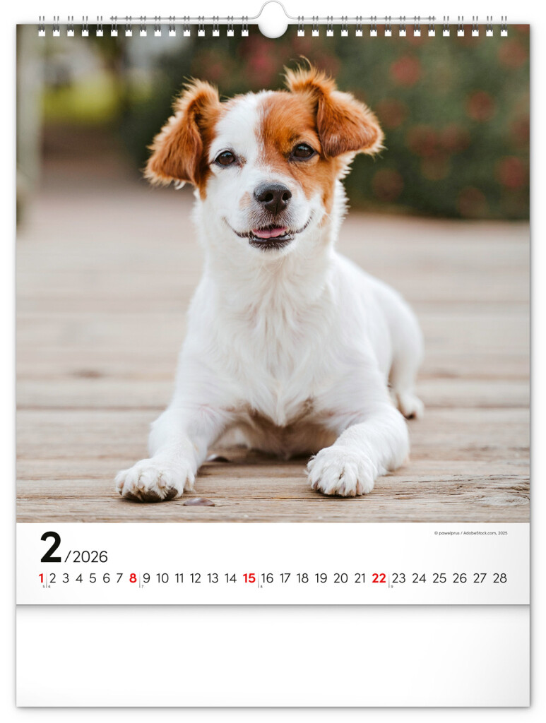 Pes je nejlepší přítel člověka. Obrázky dvanácti psích plemen doplňuje v našem nástěnném kalendáři univerzální kalendárium na bílém pozadí.
