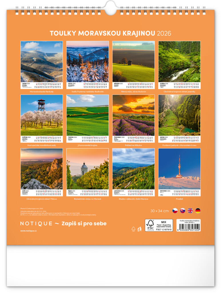 NOTIQUE Nástěnný kalendář Toulky moravskou krajinou CZ 2026, 30 x 34 cm