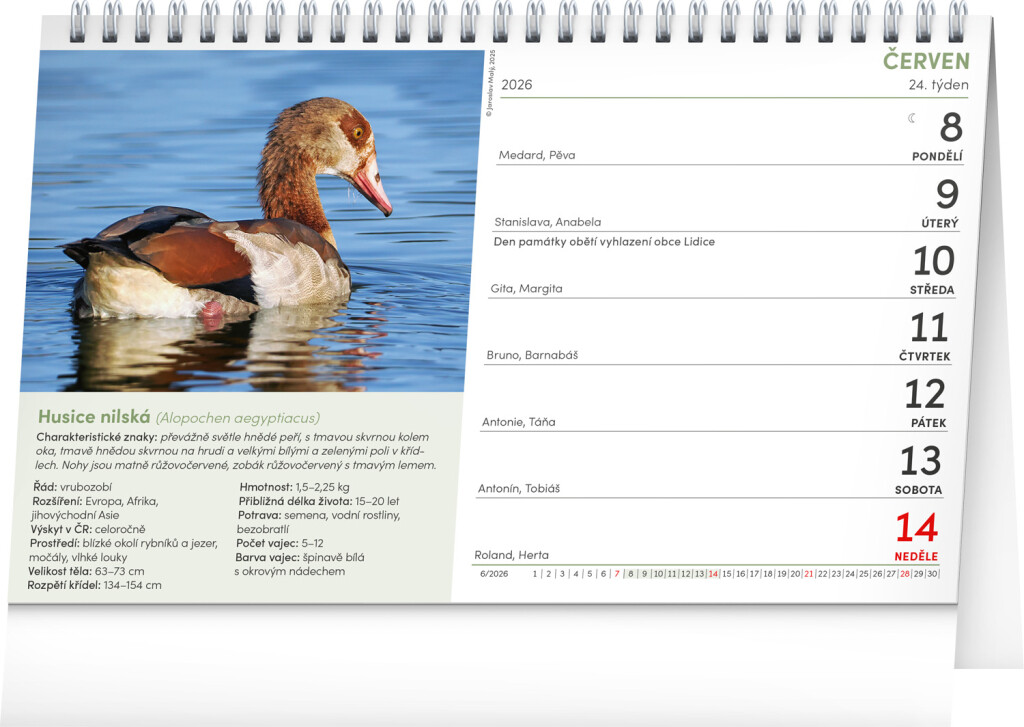Kalendář Ptáci ČR je ideální pro všechny nadšené ornitology. Najdete v něm známé i méně známé ptačí druhy. Texty a fotografie připravil odborník Jaroslav Malý. Stolní kalendář s českým kalendáriem obsahuje svátky a památné dny, fáze Měsíce a přehled na celý rok.
