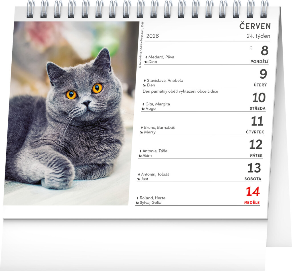 Oslavte svátek spolu se svým kočičím parťákem – v tomto praktickém stolním kalendáři naleznete jména koček na každý den. V kalendáři naleznete i data mezinárodních výstav koček v Čechách podle FIFe, pěkné fotografie a prostor pro poznámky.