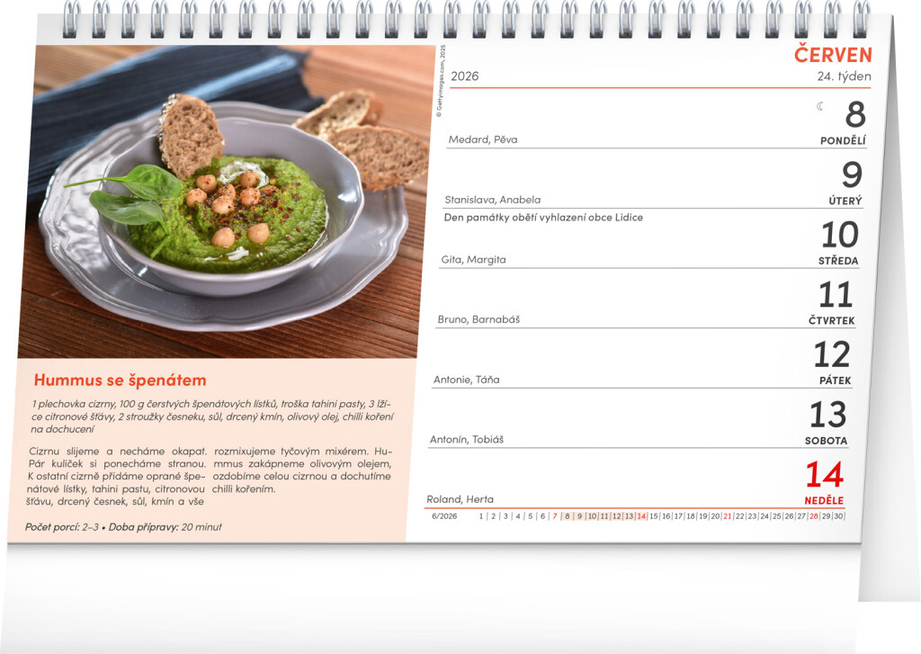 Zajímá vás, jak uvařit chutné a snadné jídlo? Stolní kalendář Recepty za kačku nabízí 53 takových tipů! Sami se budete moci přesvědčit, že vaření může být chutné i levné. Týdenní kalendář s prostorem pro poznámky obsahuje také svátky, památné dny, fáze Měsíce a přehled na celý rok 2026 a 2027.