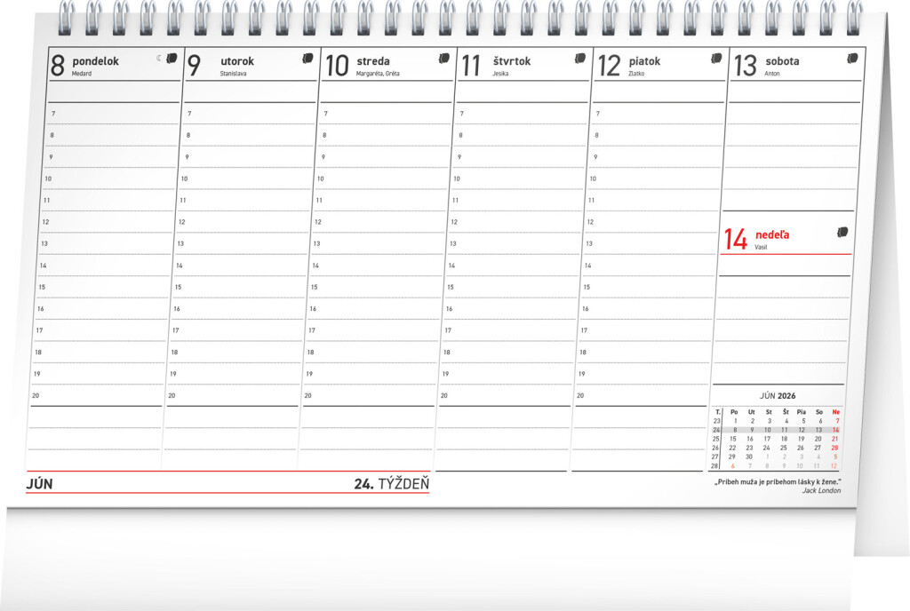 Přehledný daňový kalendář, díky kterému nezapomenete na žádnou daňovou povinnost, a navíc se dozvíte spoustu zajímavých citátů od známých osobností. Sloupcový kalendář obsahuje měsíční přehled jednotlivých týdnů, znamení zvěrokruhu, slovenská jména, svátky a památné dny.