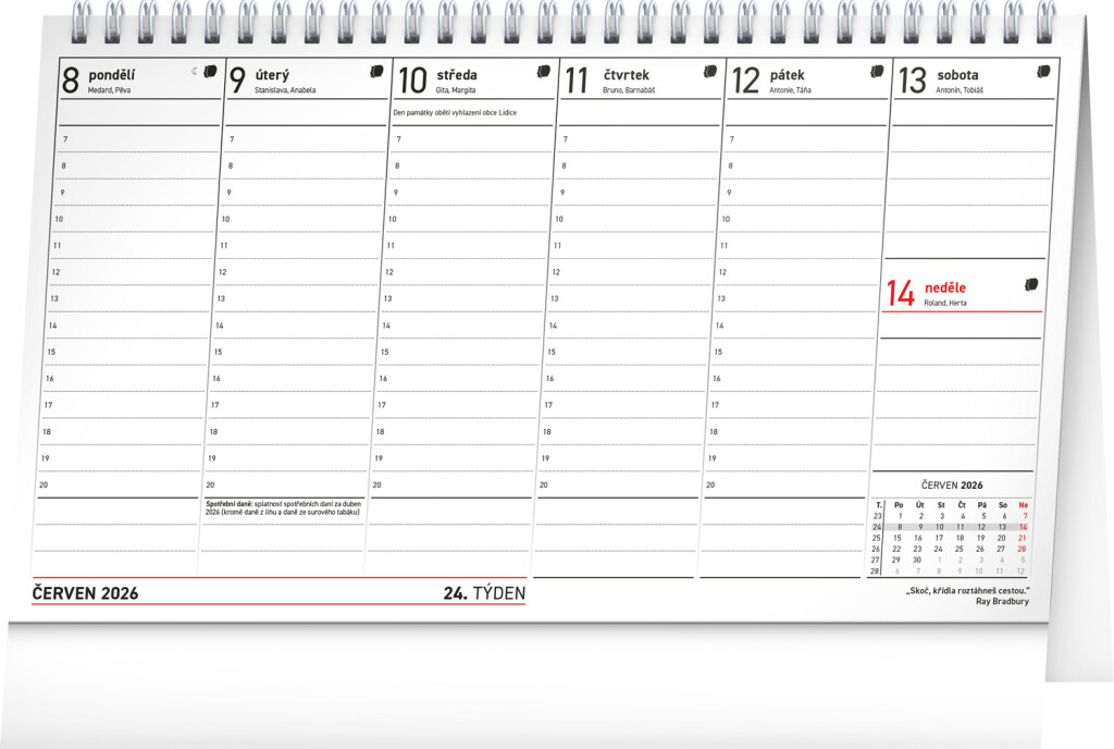 Přehledný daňový kalendář, abyste nezapomněli na žádné daňové povinnosti, a spousta zajímavých citátů známých osobností. Sloupcový kalendář obsahuje měsíční přehled v každém týdnu, znamení zvěrokruhu, jména, svátky a památné dny.