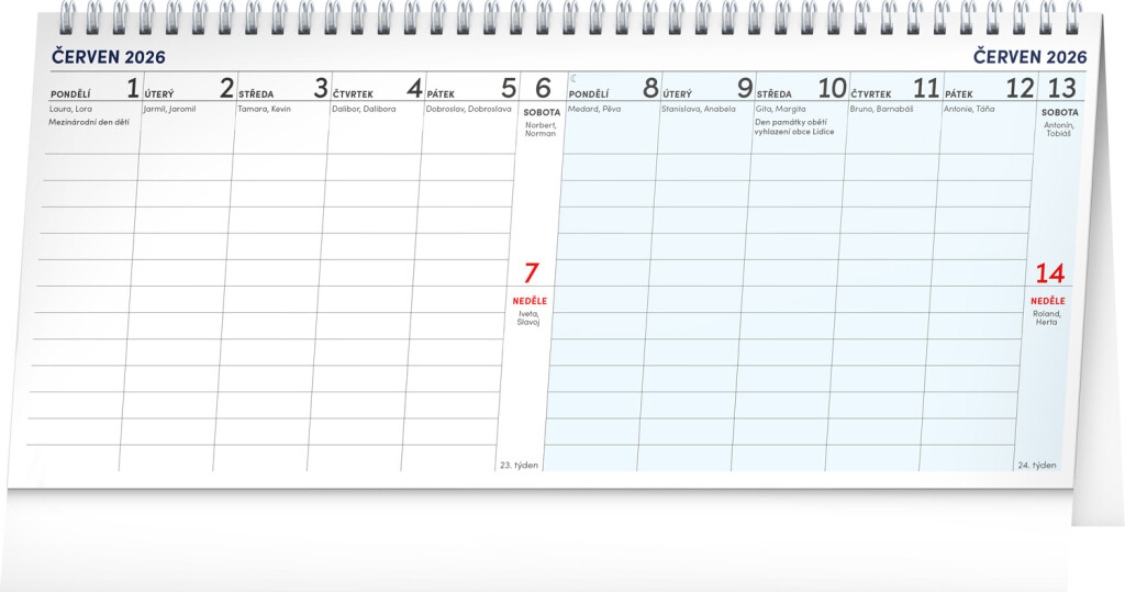 Ve čtrnáctidenním stolním kalendáři je dostatek místa na poznámky, dále pak český kalendář, svátky a památné dny a fáze Měsíce. To vše v přehledném dvoutýdenním uspořádání.