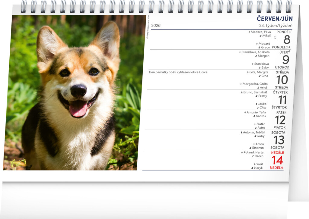 Oslavte svátek společně se svým psím parťákem - v tomto praktickém stolním kalendáři najdete psí jména na každý den. Kalendář obsahuje týdenní české a slovenské kalendárium se svátky a památnými dny, psími jmény a fázemi měsíce. Kalendář zdobí pěkné fotografie Zuzany Tillerové a nechybí ani prostor pro poznámky.