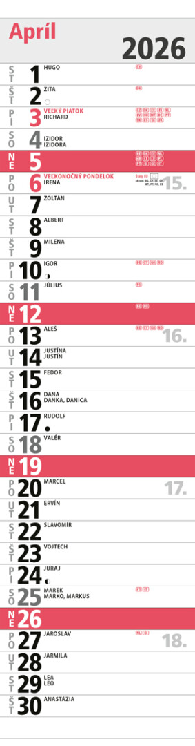 Moderní a přehledný nástěnný kalendář v červeném designu nabízí praktický měsíční kalendář se jmény SK, svátky SK+EU a fázemi měsíce. Ideální pro denní plánování, připomenutí narozenin, jmenin nebo důležitých událostí v průběhu roku.