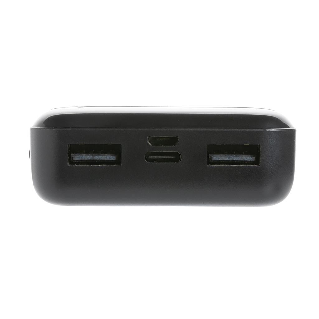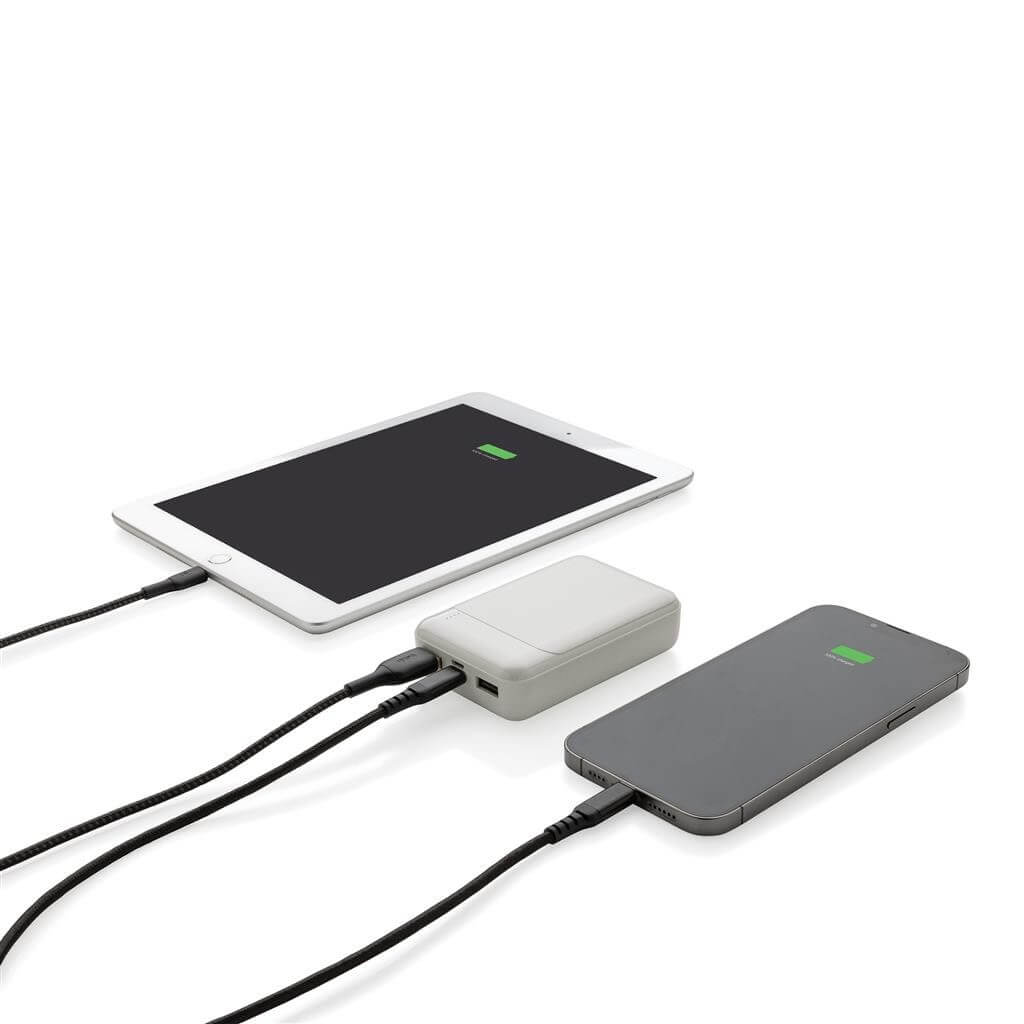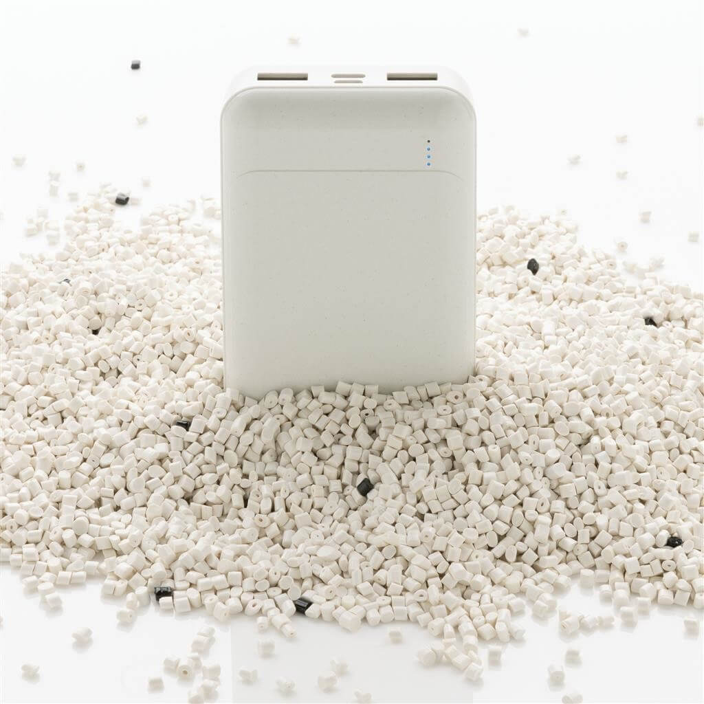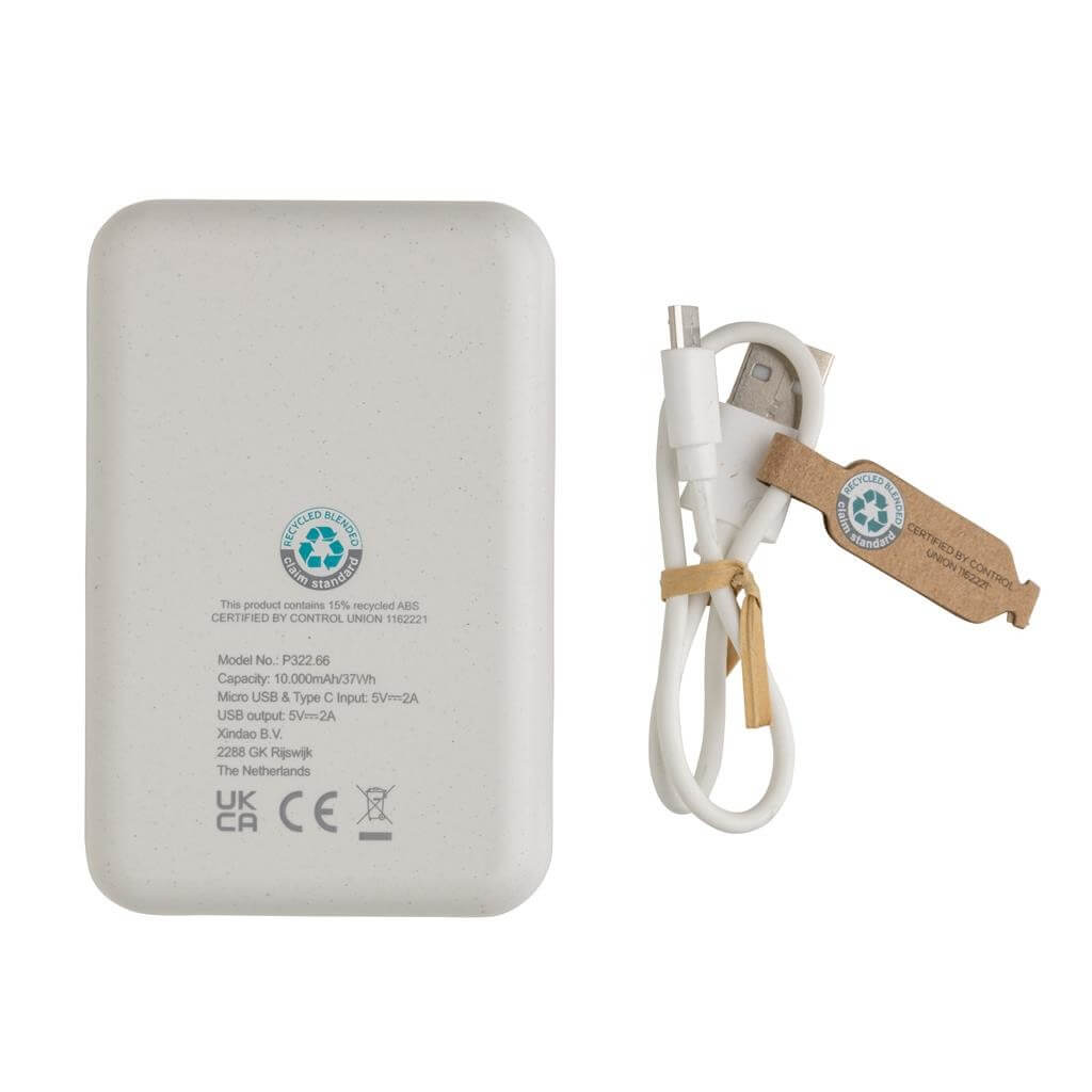 Kapesní powerbanka s kapacitou 10 000 mAh vyrobená z recyklovaného ABS plastu s RCS certifikací. RCS (Recycled Claim Standard) je globální standard, který umožňuje ověřit použití recyklovaného materiálu v produktu napříč celým dodavatelským řetězcem. Kvalitní lithium polymerová baterie řady A s kapacitou 10 000 mAh plně nabije mobilní telefon až 4x. Světelné indikátory stupně nabití. Micro USB vstup: 5V/2A, USB C vstup: 5V/2A. USB výstup: 5V/2A. Včetně micro USB nabíjecího kabelu z recyklovaného TPE. Výrobek je kompletně bez PVC. 1 baterie typu Li-poly v balení.