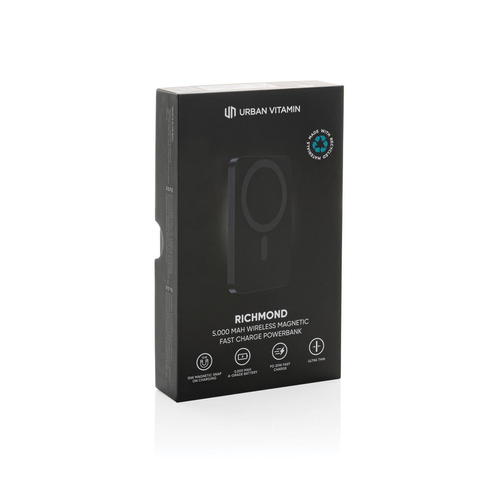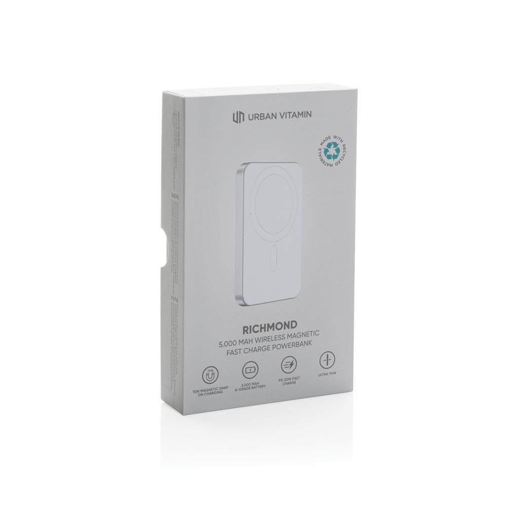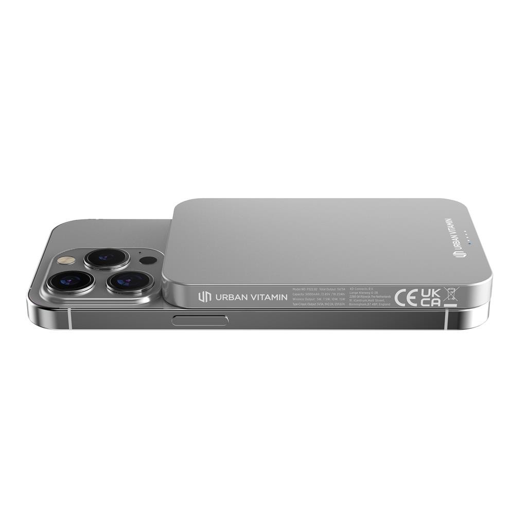 Magnetická powerbanka pro snadné bezdrátové nabíjení telefonů (iPhone 12 a výše, nejnovější Android telefony) s vysokým výkonem až 15W. Drátové nabíjení rychlostí až 20W skrze USB C, kterým lze nabíjet jak powerbanku samotnou, tak jiná zařízení. Vysoce kvalitní 100 % kobaltová baterie s kapacitou 5 000 mAh. V porovnání s běžnými lithiovými bateriemi je kobaltová výkonnější a vydrží déle. Vyrobeno z recyklovaného hliníku a ABS s RCS certifikací (Recycled Claim Standard). 1 baterií typu Li-poly v balení.