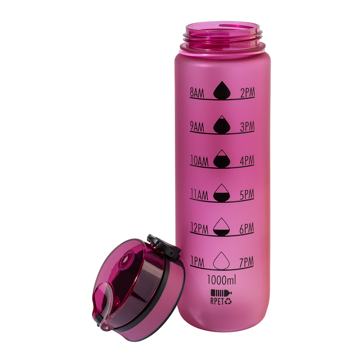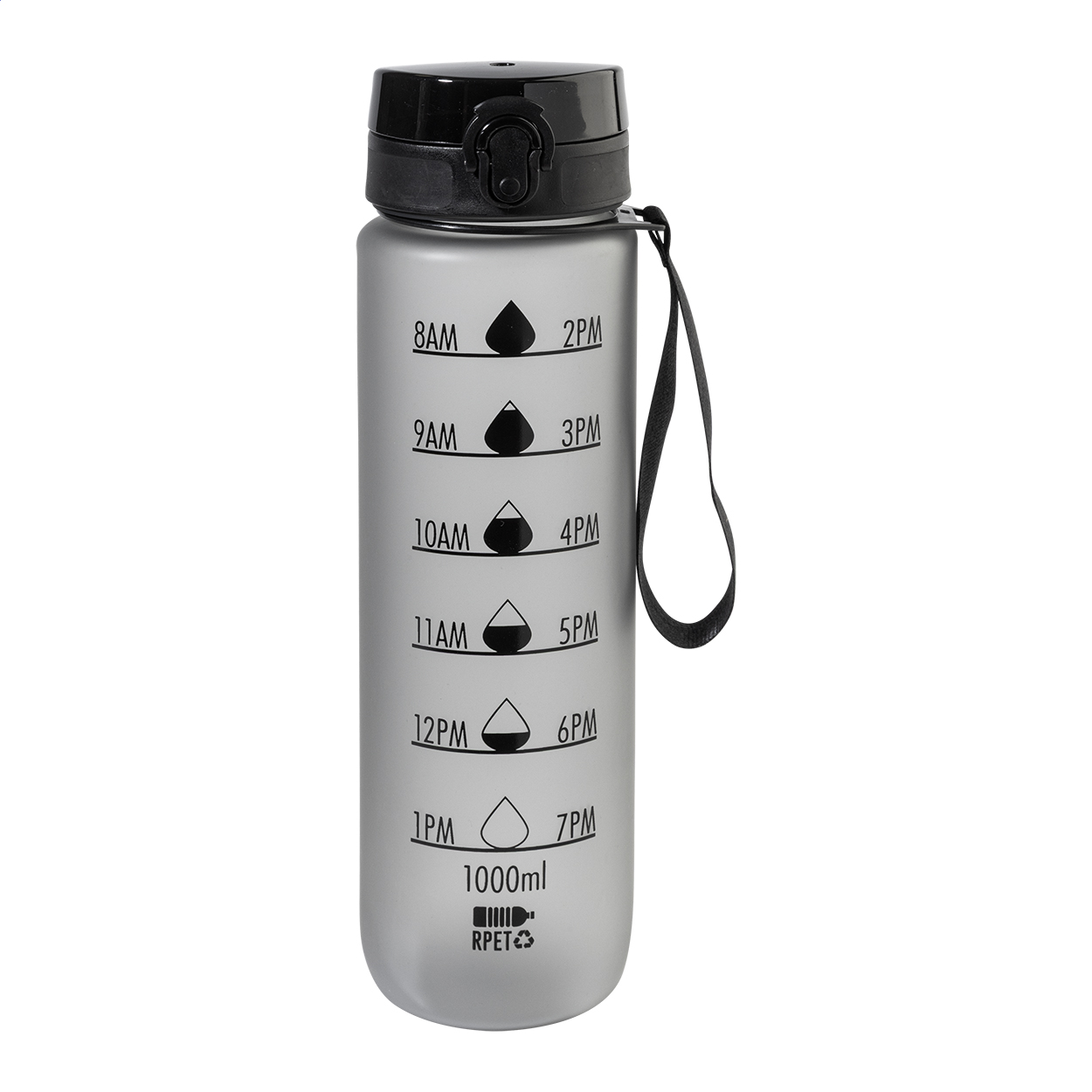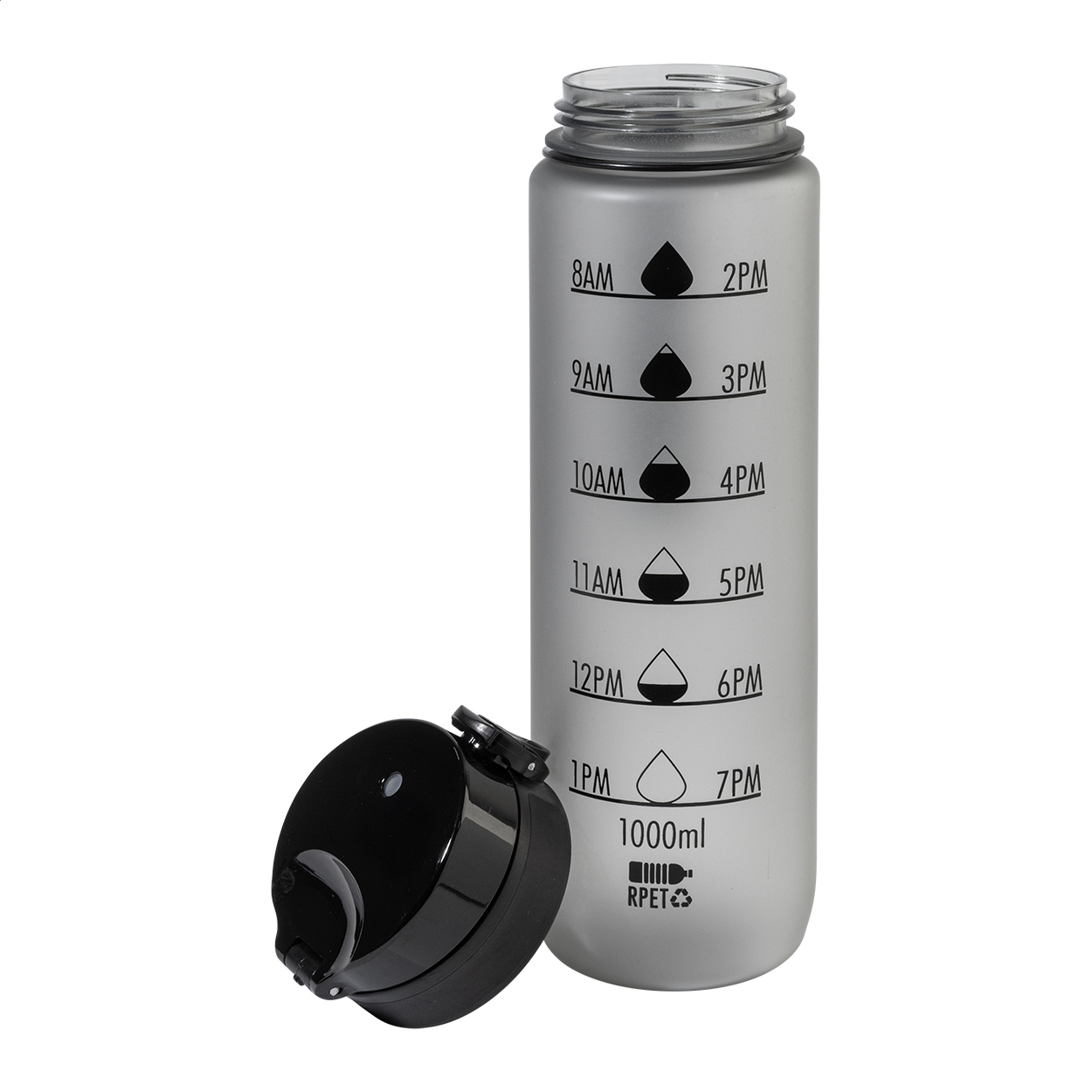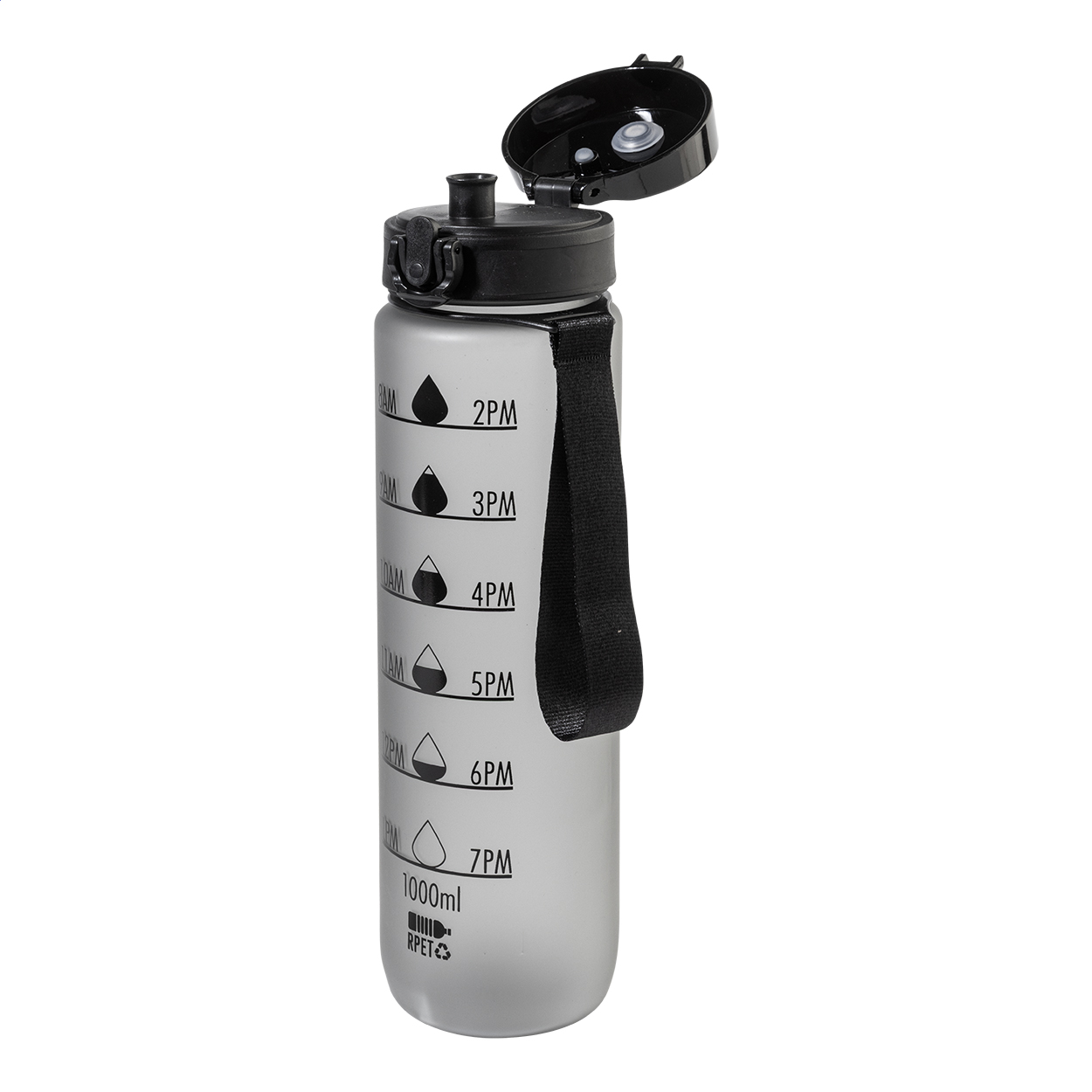 Sportovní láhev z matného RPET s motivačním objemovým a časovým značením, s automaticky otevíratelným odklápěcím víčkem s bezpečnostním zámkem a poutkem na nošení. 1000 ml. Bez BPA. Nevhodné pro sycené nápoje. New. Go Green. Vhodné do myčky nádobí: Ne. Vhodné do mirkovlnné trouby: Ne. Odolné vůči polití / nepropustné: Nepropustné
