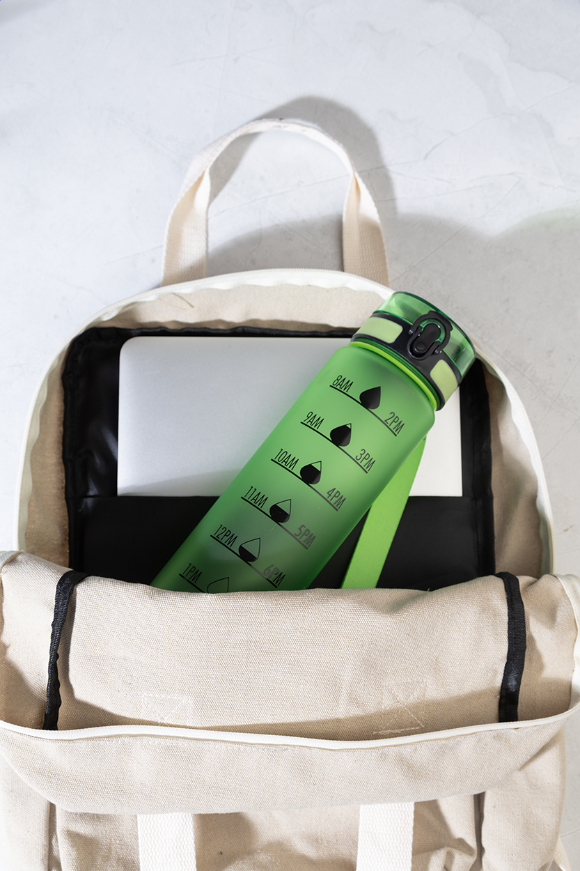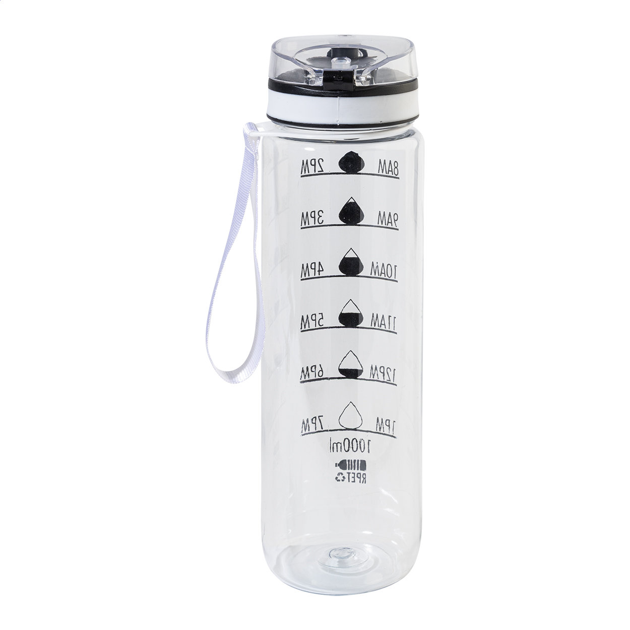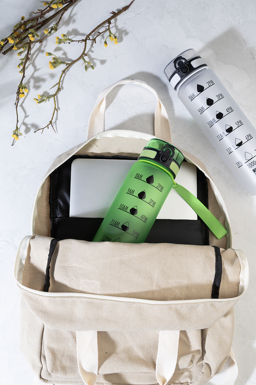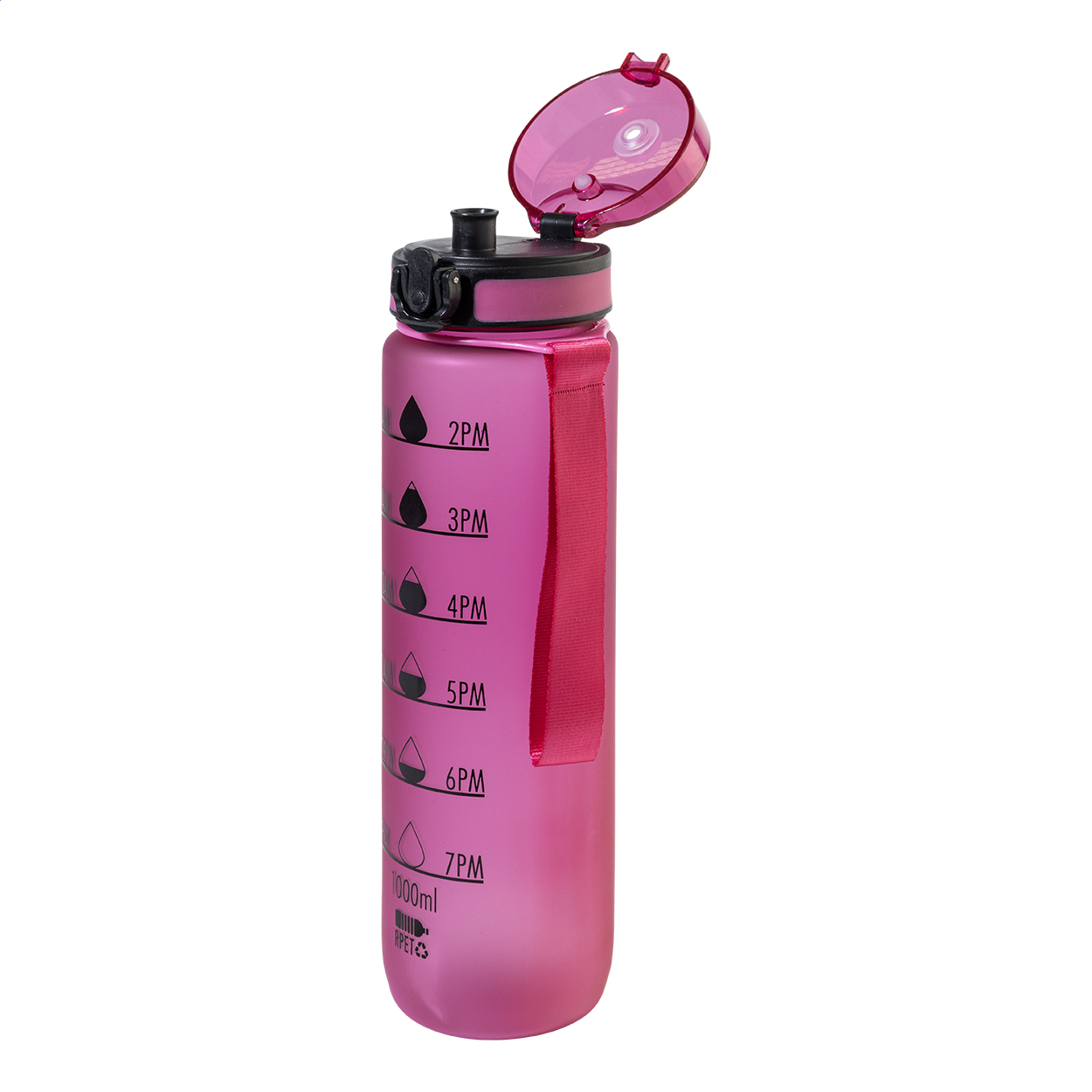 Sportovní láhev z matného RPET s motivačním objemovým a časovým značením, s automaticky otevíratelným odklápěcím víčkem s bezpečnostním zámkem a poutkem na nošení. 1000 ml. Bez BPA. Nevhodné pro sycené nápoje. New. Go Green. Vhodné do myčky nádobí: Ne. Vhodné do mirkovlnné trouby: Ne. Odolné vůči polití / nepropustné: Nepropustné