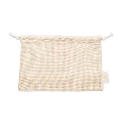 Síťovaná bavlněná kapsa na potraviny, na míru pro čerstvé potraviny, vyrobená ze 100% bavlny. Jedna strana je z bavlny (140 g/m²), kterou lze potisknout celoplošně v požadovaném provedení. Druhá strana je ze síťované bavlny. Rozměr 30x20cm. Hromadně zabalené (nepoužívají se žádné plasty) a volitelně každá sáček může být zabalena do papírového obalu s vlastním potištěným designem. Lze prát v rukou.