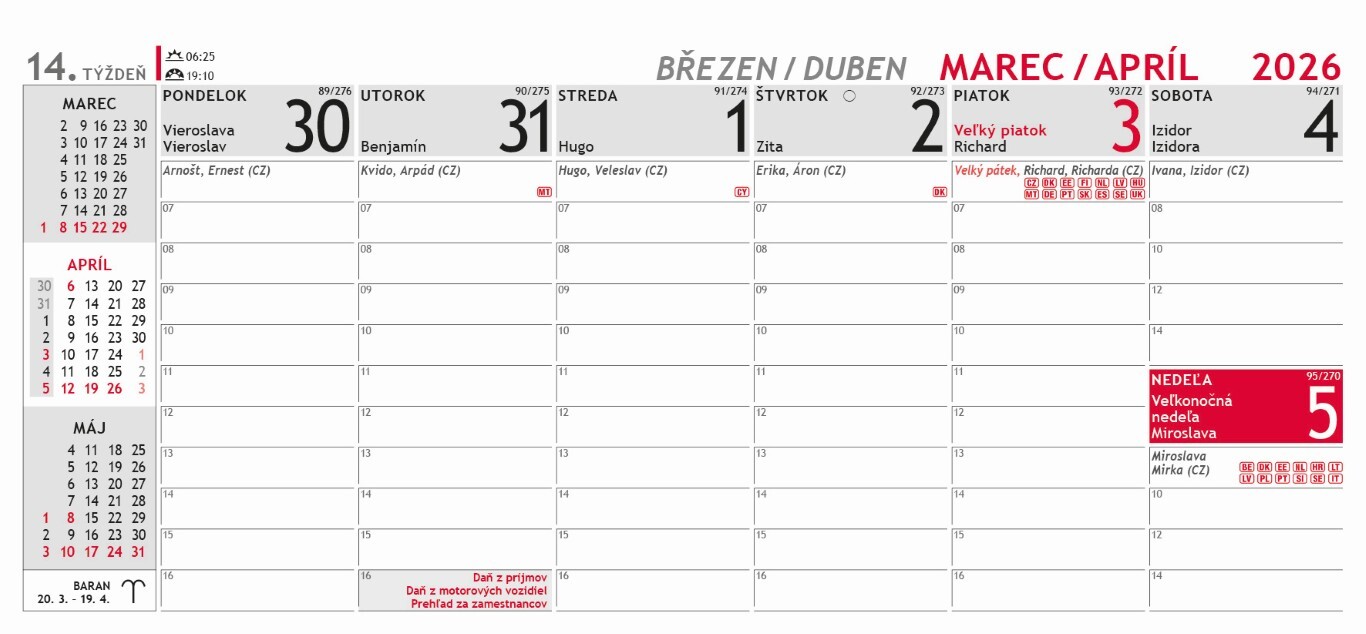 Praktický plánovací kalendář s přehledem nadcházejících měsíců na levé straně. Dostatek prostoru pro plánování celého týdne. Obsahuje daně, fond pracovní doby, svátky EU, východy a západy slunce, fáze měsíce.