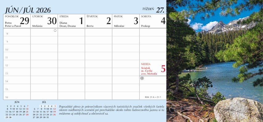 Začněte každý týden pohledem, který vám vyrazí dech! Tento sloupcový týdenní kalendář obsahuje úchvatné fotografie tatranských vrcholů, dolin a stezek, které vás budou motivovat k objevování krás našich velehor. Každá fotografie je doplněna popisem místa, takže se můžete s jednotlivými tatranskými lokalitami lépe seznámit a získat inspiraci pro své vlastní turistické výlety. Kalendář, který vás každý den zavede do Tater.