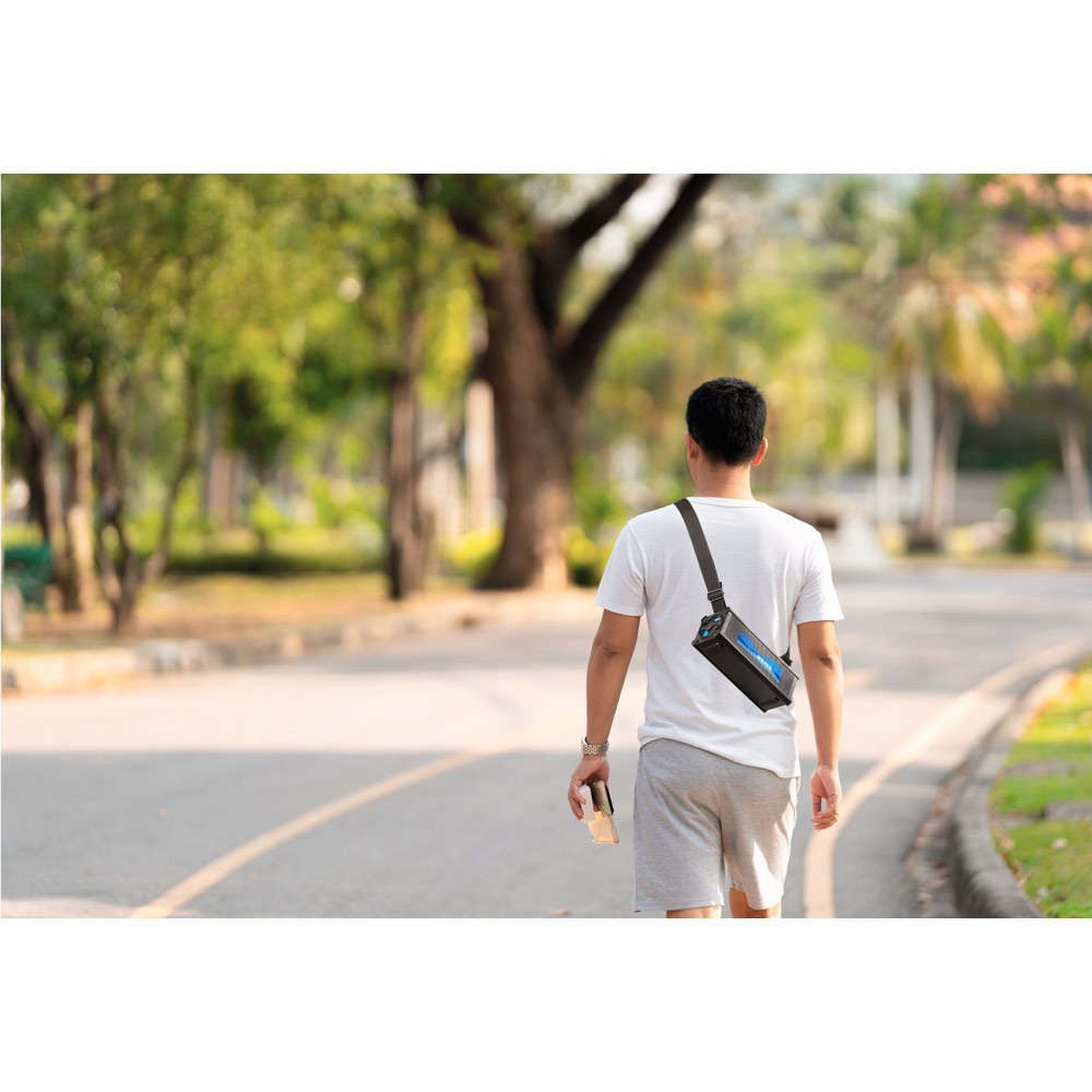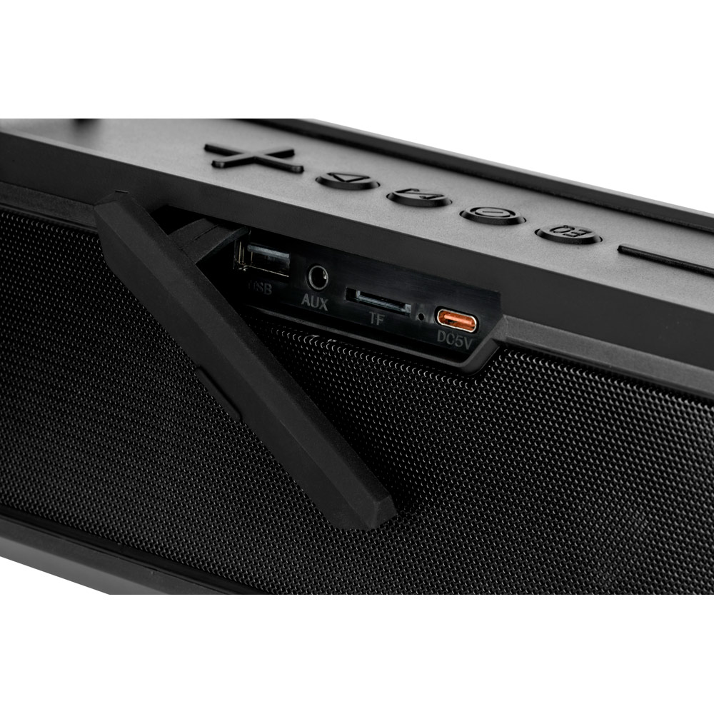 Přenosný reproduktor z ABS. S bezdrátovým přenosem BT v5'0, ekvalizérem se 4 přednastavenými režimy, USB-A vstupem a 3.5mm pomocným vstupem. Se zvukovým výkonem 16W (2x 8W) a velkou 3 000 mAh baterií poskytuje přibližnou výdrž baterie 5 hodin a funguje jako power banka přes USB-A port. Přiložený popruh na přenášení umožňuje snadné a bezpečné přenášení nebo zavěšení reproduktoru. Hlasitost a seznam skladeb můžete ovládat ze svého mobilního zařízení. Velké mřížky umožňují větší prostor přizpůsobení. Obsahuje nabíjecí kabel USB-C a 3.5 mm audio kabel. Dodáváno v bílé dárkové krabičce. 250 x 100 x 90 mm