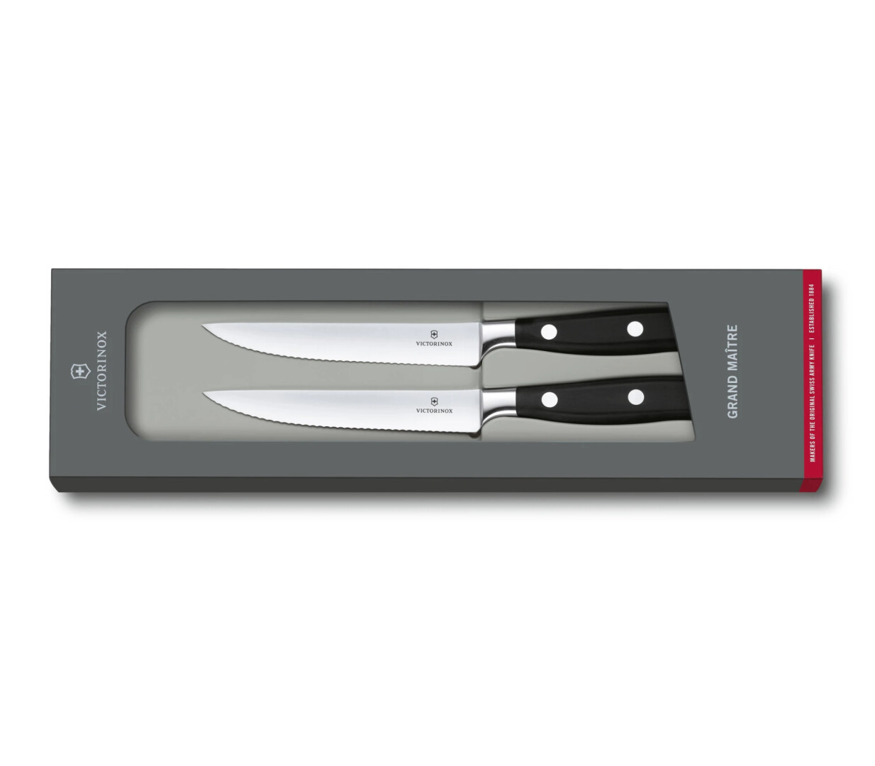 Sada celokovaných nožů na steak se zoubkovanou čepelí 2-dílná s nýtovanými rukojeťmi vyrobenými z plastu zpracovávaného za velmi vysoké teploty, který nevsakuje vodu a je mimořádně pevný. Souprava sestává ze dvou nožů na steak se zoubkovanou čepelí 12 cm.