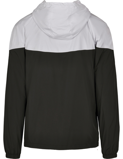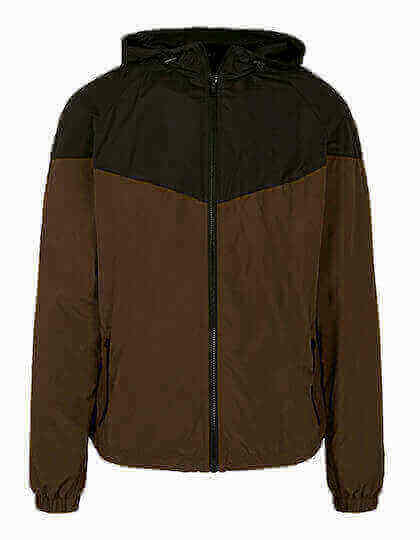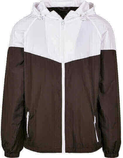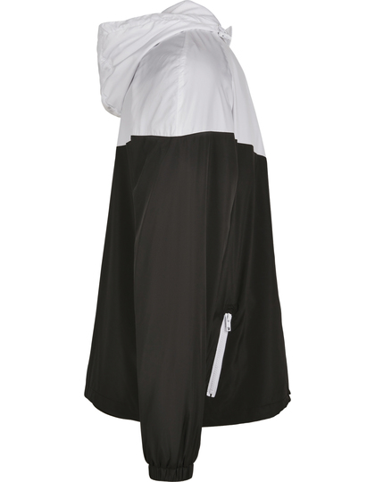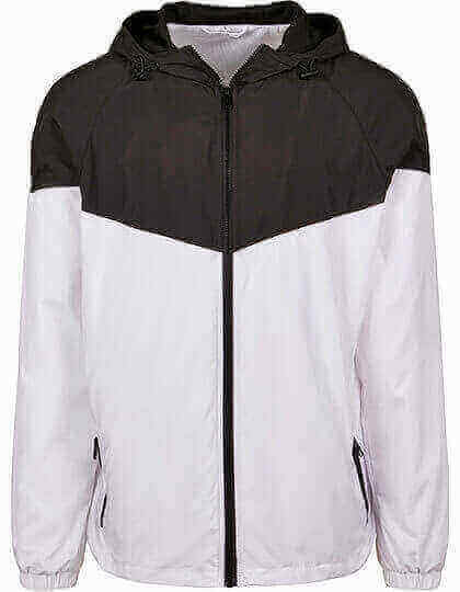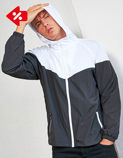 Barevné rozdělení bundy: ramenní část je odlišná. Raglánový střih. Kapuce se síťovanou podšívkou se stahovací šňůrkou se zarážkami. Boční kapsy na zip. Elastické manžety na rukávech a lemu. Přední strana s propínacím zipem.