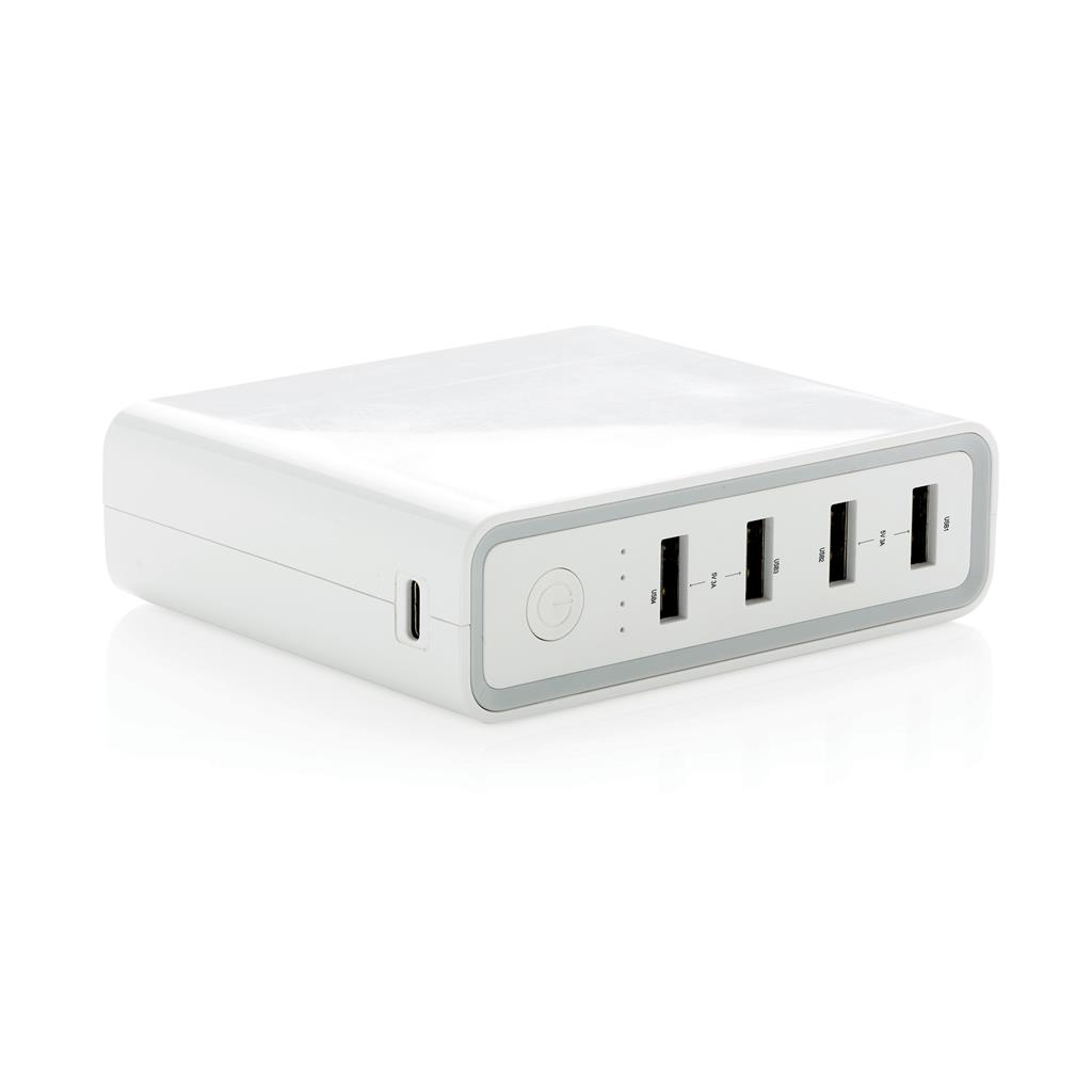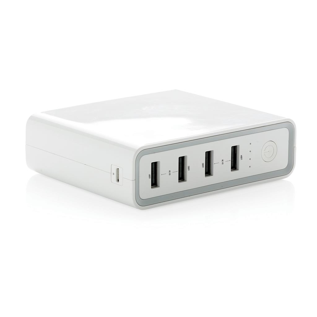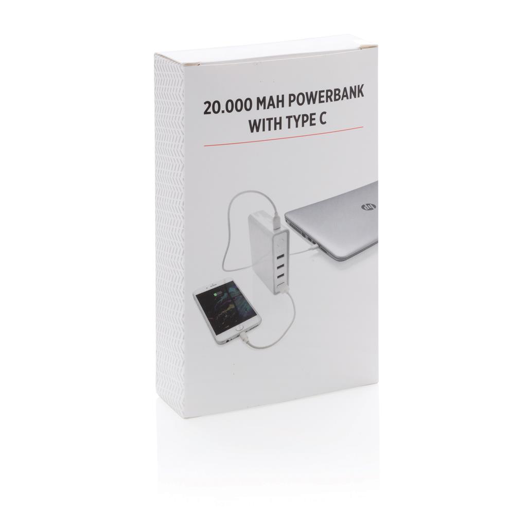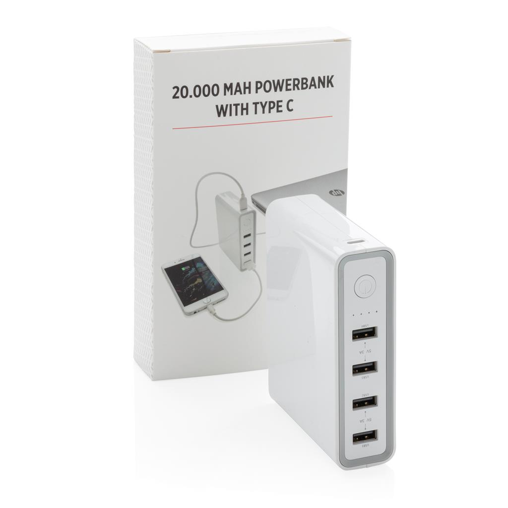 Mimořádně výkonná přenosná powerbanka s lithiovou baterií o kapacitě 20 000 mAh se 4 USB porty a jedním portem typu C 3.0 (vstup i výstup). Powerbanku tak lze dobíjet skrze klasický micro USB port (2A), ale i skrze ultra rychlý USB port typu C (2,4A). Powerbanka je vhodná pro rychlé nabíjení telefonů, tabletů, ale i notebooků (s USB C). Vyrobena z odolného ohnivzdorného ABS s UV povrchovou úpravou. Včetně kabelu USB micro a USB C. Výstup: 4x 5V/2A, 1x 5V/9V/14,5V/2,4A. 4 baterií typu Li-poly součástí balení