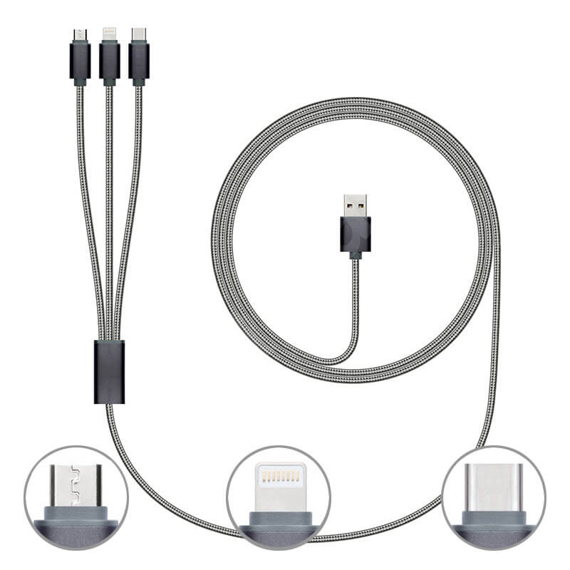 Univerzální napájecí kabel s USB Type-C, Lightning a USB micro redukcí. Kvalitní textilem opletený napájecí kabel v moderních metalických barvách. Nový konektor Type-C znamená budoucnost - a je dobré být na ni připraven.