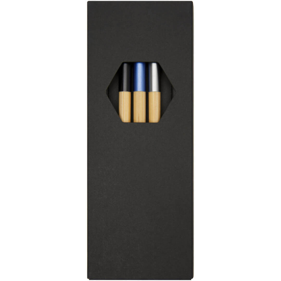 Sada kuličkových per s exkluzivním designem, skládající se ze tří kuličkových per s barevným akcentem. Kuličkové pero s modrou hliníkovou deskou je předem naplněno modrou náplní, zatímco zbývající dvě pera jsou předem naplněna černou náplní. Zabaleno v dárkové krabičce.