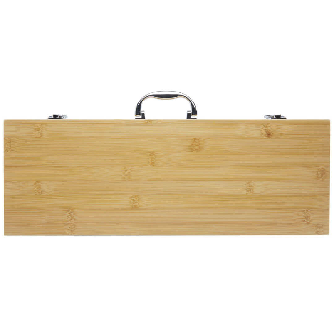 Bambusová třídílná grilovací sada s lopatou (42 × 9,5 cm), kleštěmi (46 × 2,2 cm) a vidličkou (43 × 3,2 cm). Sada je dodávána v bambusové dárkové krabičce (51,5 × 18,2 × 7,2 cm). Rukojeti a dárková krabička jsou vyrobeny z bambusu, který se získává a vyrábí v souladu se zásadami udržitelnosti.