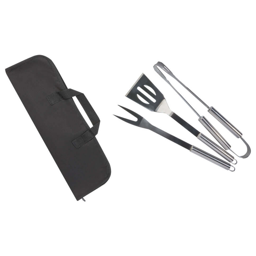 3dílná grilovací sada s lopatou (34,8 × 7,5 cm), vidličkou (35,4 × 3,35 cm) a kleštěmi (35 × 6,8 × 4 cm). Veškeré příslušenství je dodáváno v lehkém pouzdře, které usnadňuje přenášení a skladování. Ideální příslušenství ke grilování na zahradě nebo na venkovní grilování s přáteli a rodinou.