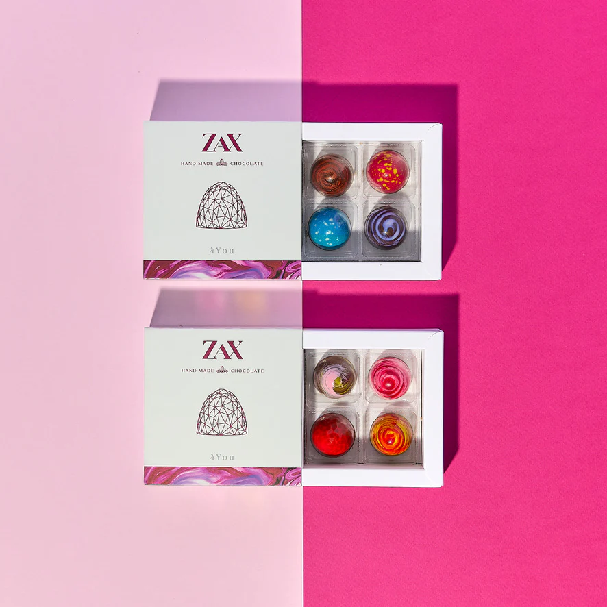 4You je ideální jako milé překvapení, ochutnávka nových příchutí či malý firemní dárek s vaším logem. V krabičce naleznete čtveřici vybraných nejčerstvějších pralinek – každá ručně malovaná, v krásných barvách as unikátní nádivkou. Prémiové pralinky spojují tenkou křupavou čokoládu v kombinaci s nádivkou v až 40 originálních příchutích. Bez konzervantů, palmového oleje a gMO, vyrobeno ze 100% kakaového másla a ovocných pyré. Trvanlivost: 6 týdnů až 4 měsíce. Rozměr: 90×90×30 mm. Váha: 35 g
