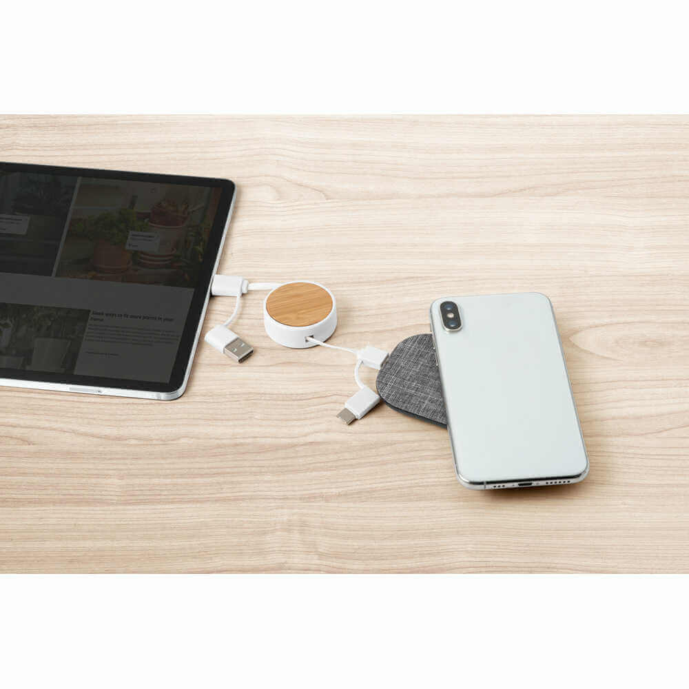 Zatažitelný 5v1 ABS a bambusový kabel. Jeden konec je USB-C s adaptérem pro USB-A, zatímco druhý konec má speciální micro-usb a iOS tip 2 v 1 (rychle-nabíjecí) s adaptérem pro USB-C. Vstup/výstup: 5V/1A. Dodáváno v papírové krabičce.48 x 130 mm | Natažený kabel: 40 x 850 mm