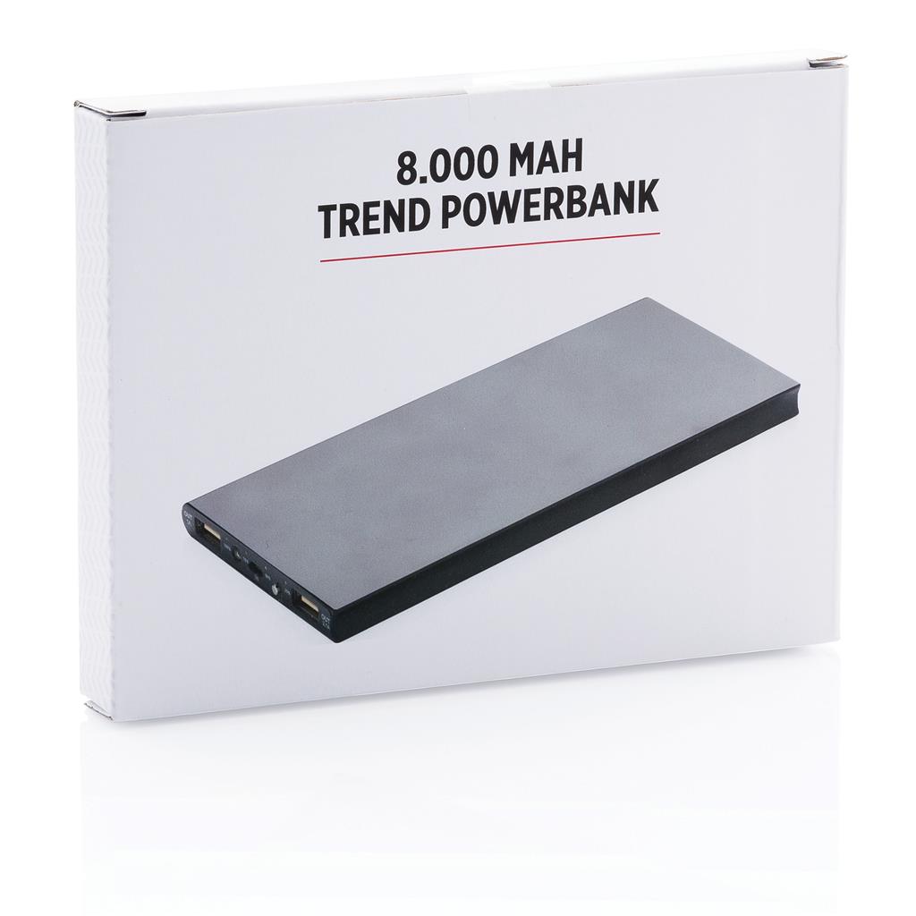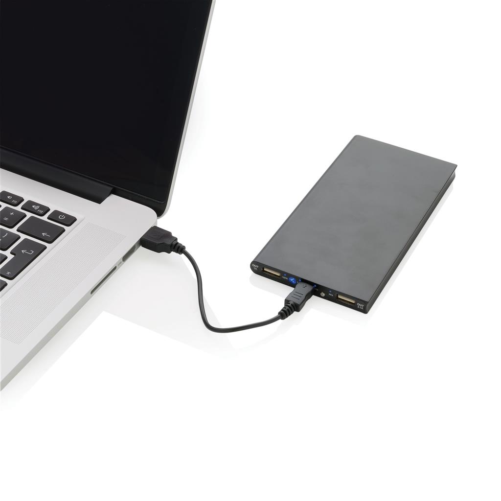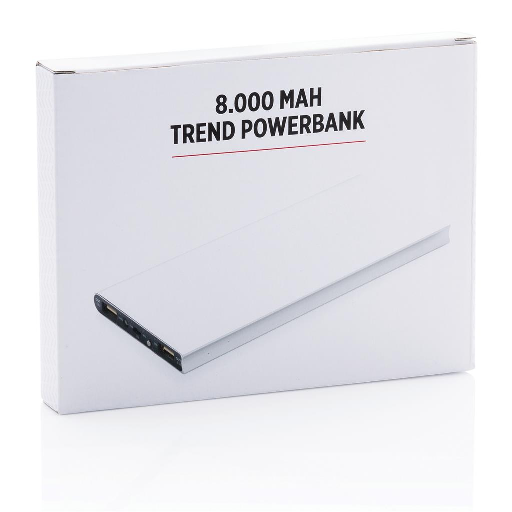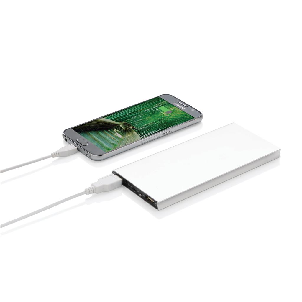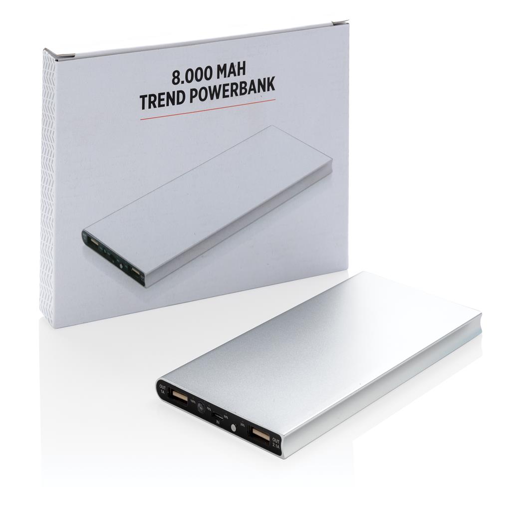 Hliníková powerbanka se dvěma USB porty pro nabíjení dvou mobilních zařízení současně. Dostatečná kapacita pro 3–4 dobití průměrného telefonu nebo dobití tabletu. Kapacita 8 000 mAh, celkový výstup: 5 V/2.1 A, vstup: 5 V/1 A. Včetně micro USB kabelu a 1 baterií typu Li-poly.