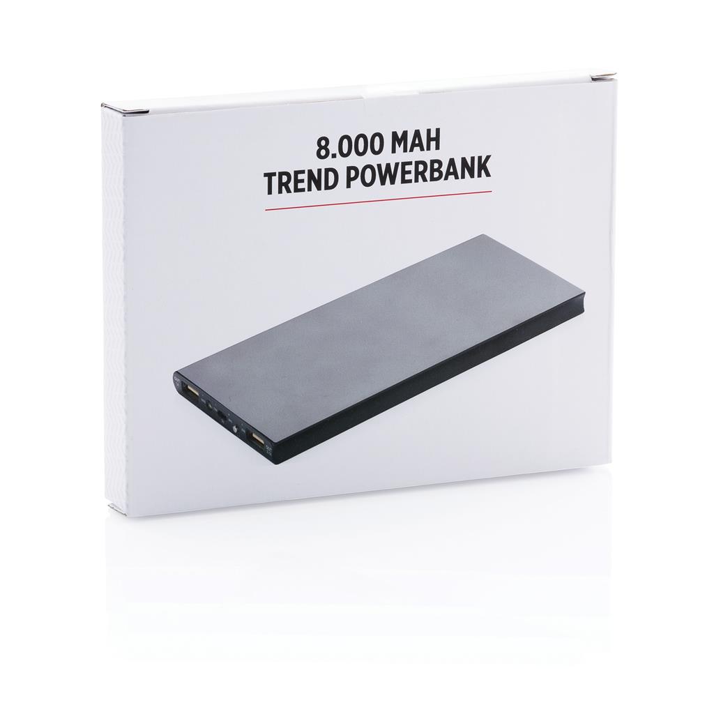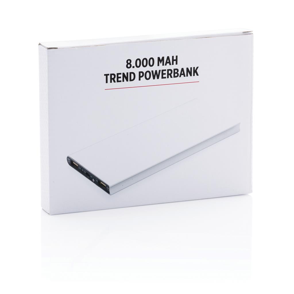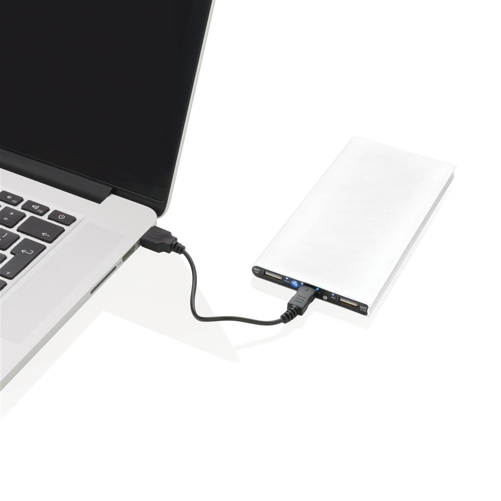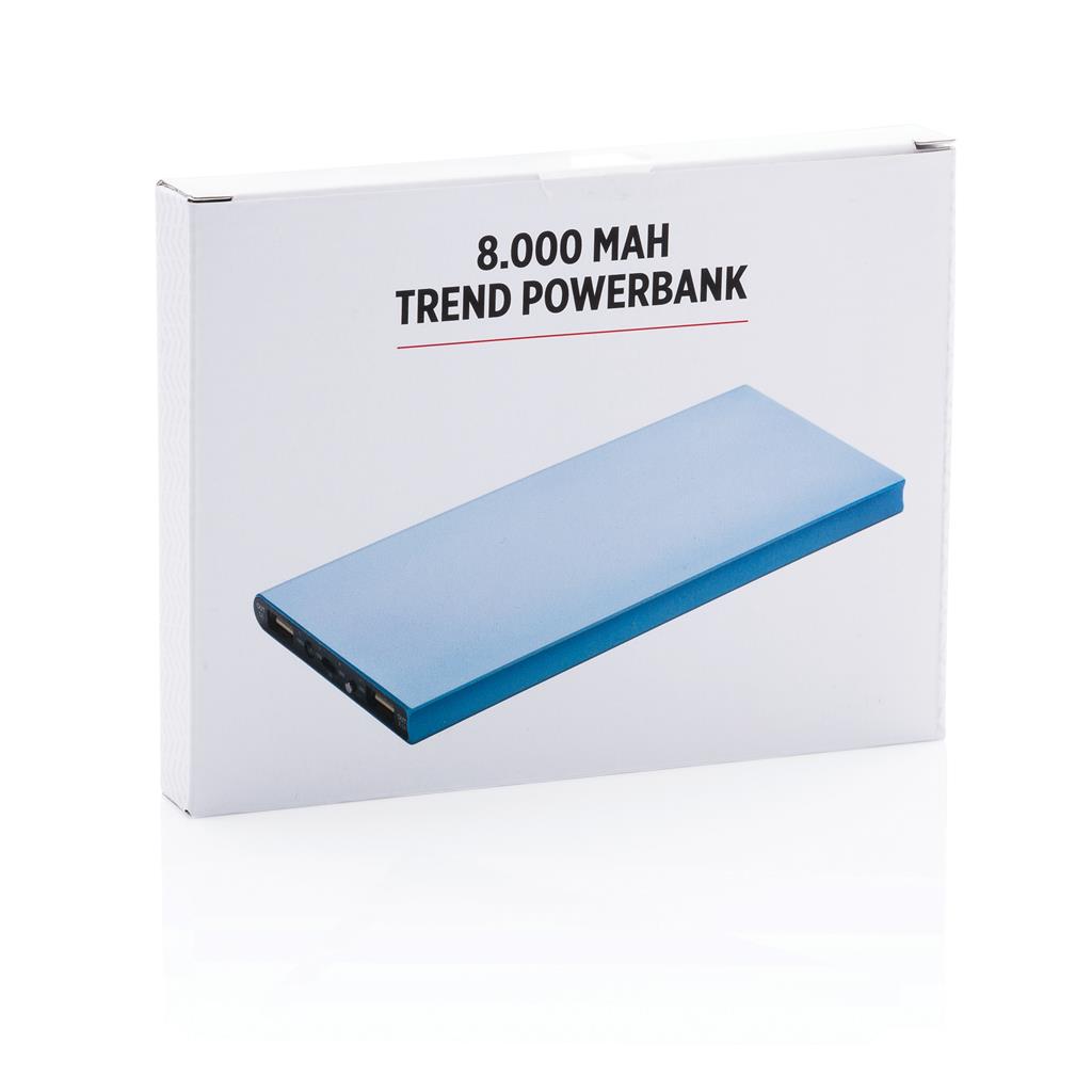 Hliníková powerbanka se dvěma USB porty pro nabíjení dvou mobilních zařízení současně. Dostatečná kapacita pro 3–4 dobití průměrného telefonu nebo dobití tabletu. Kapacita 8 000 mAh, celkový výstup: 5 V/2.1 A, vstup: 5 V/1 A. Včetně micro USB kabelu a 1 baterií typu Li-poly.