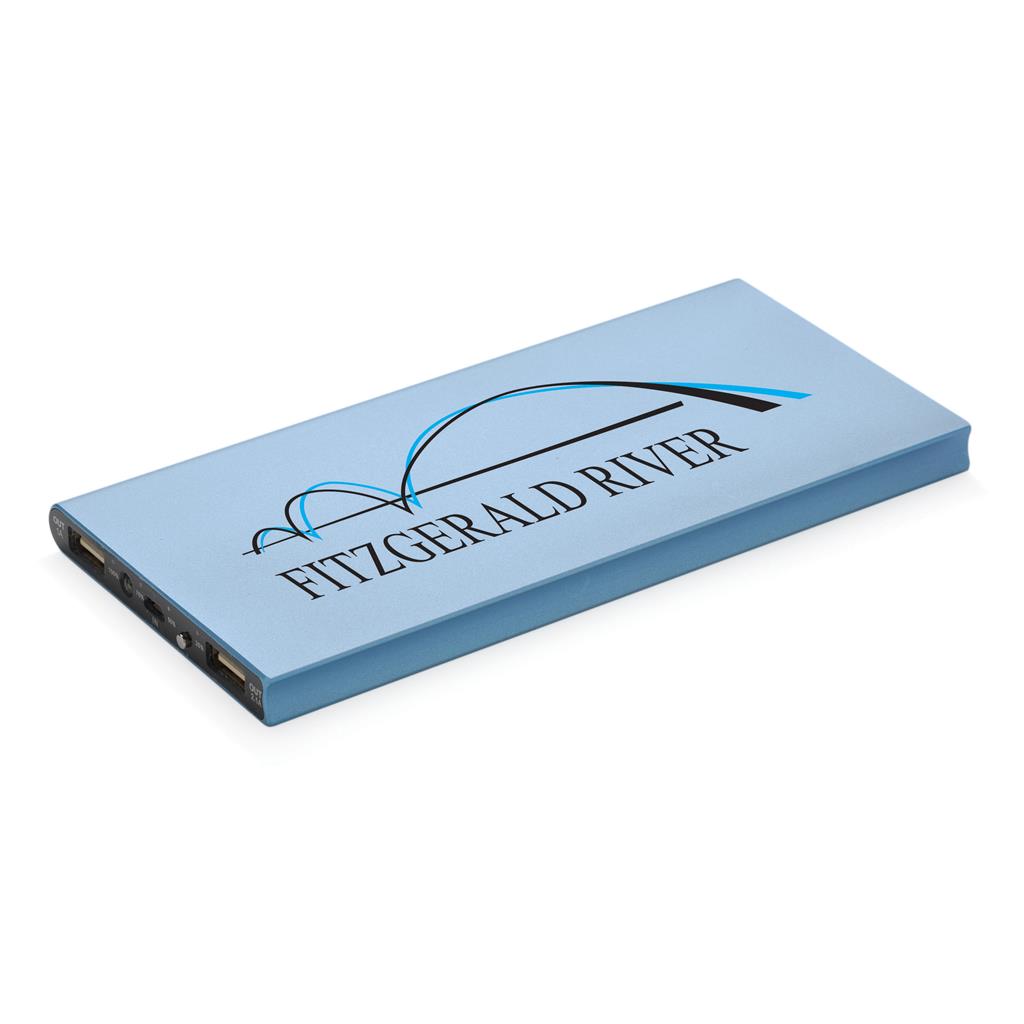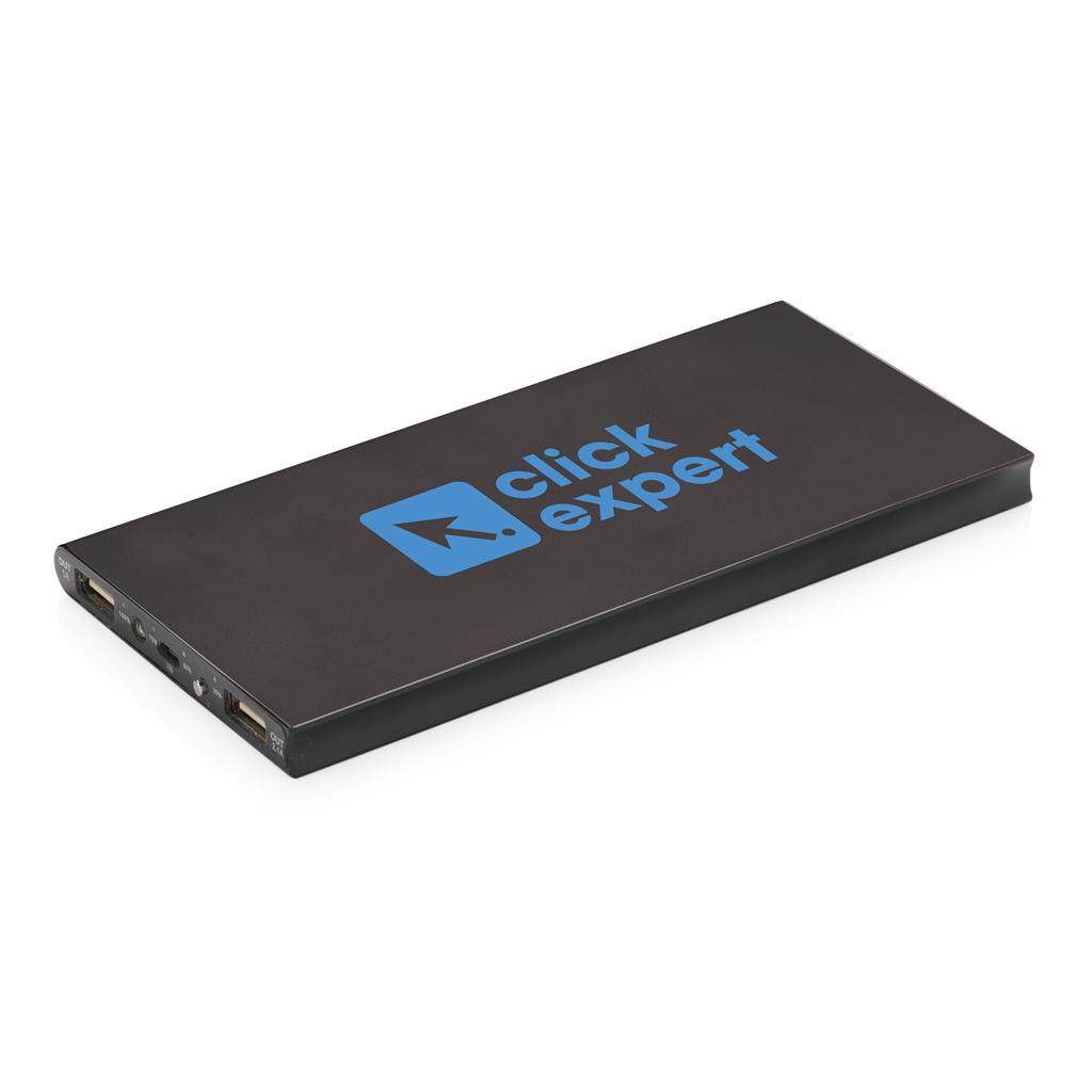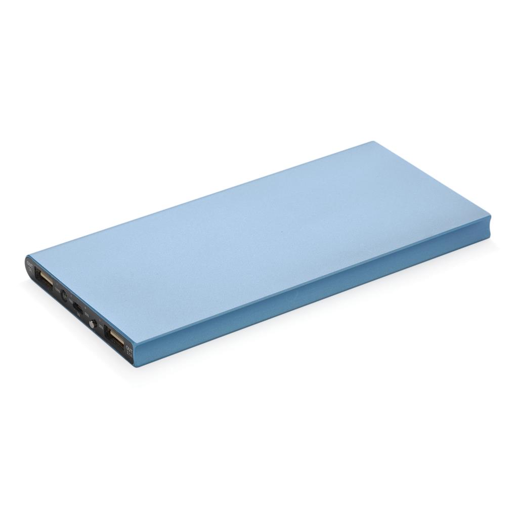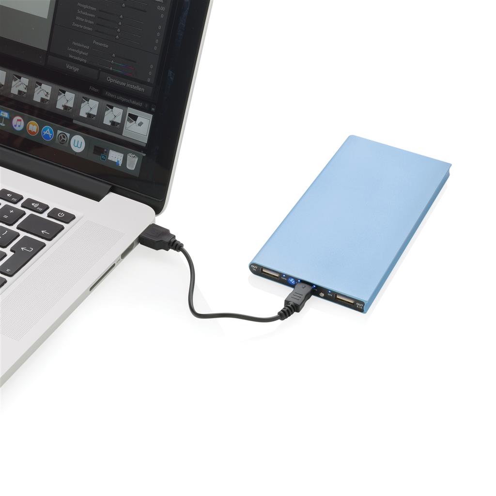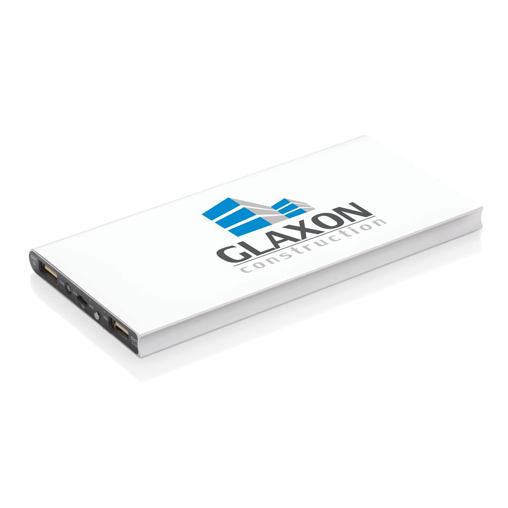 Hliníková powerbanka se dvěma USB porty pro nabíjení dvou mobilních zařízení současně. Dostatečná kapacita pro 3–4 dobití průměrného telefonu nebo dobití tabletu. Kapacita 8 000 mAh, celkový výstup: 5 V/2.1 A, vstup: 5 V/1 A. Včetně micro USB kabelu a 1 baterií typu Li-poly.
