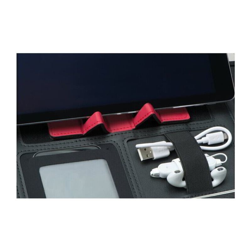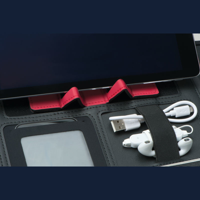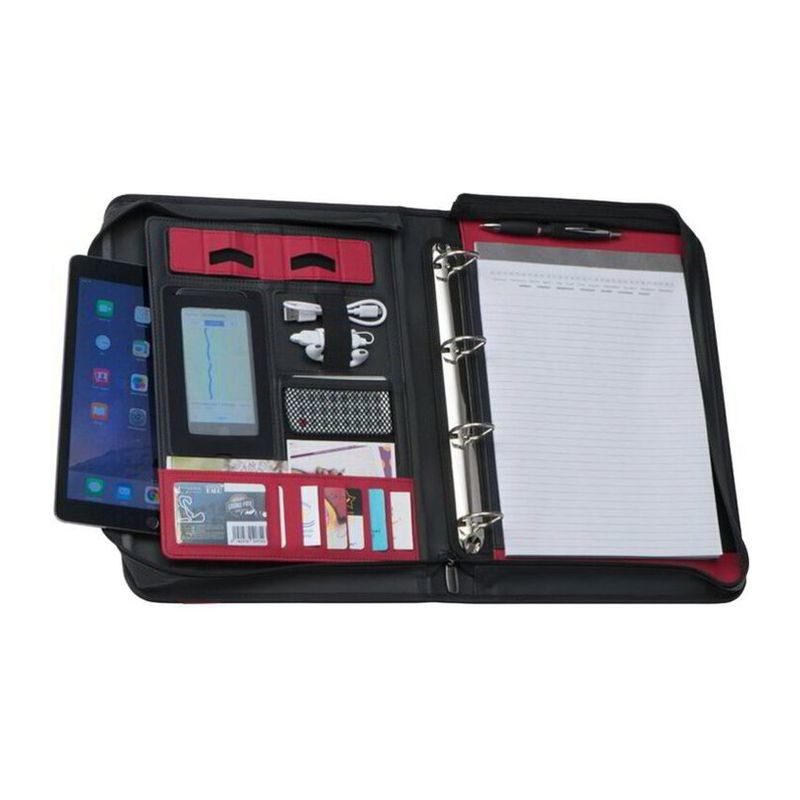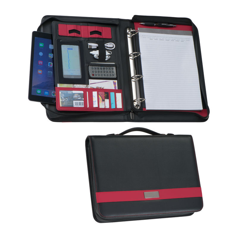 Konferenční mapa A4 ze syntetické kůže s uzavíráním na zip a praktickou rukojetí obsahuje smyčku na pero, kroužkový mechanismus, poznámkový blok (30 listů), držák na tablet, kapsu na mobil, 1 gumový pás, 8 přihrádek, velkou přihrádku.