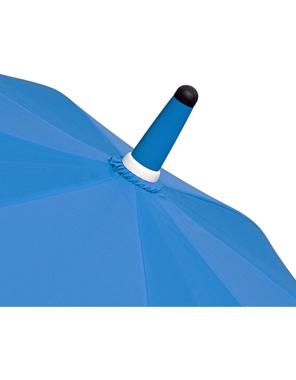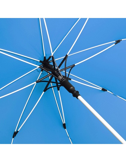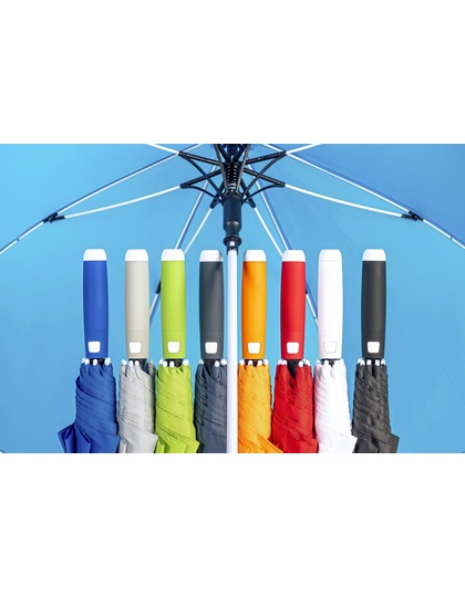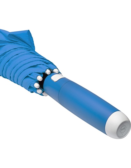 Praktické automatické rychlé otvírání. Vysoce kvalitní větruodolný systém pro maximální pružnost rámu při silnějších poryvech větru, flexibilní bílé laminátové kolejnice. Robustní ocelová tyč s bílým plastovým obalem. Polyesterový materiál střechy z recyklovaných plastů. Bílé plastové koncovky. Elegantní rukojeť s měkkým povrchem, integrovaným uvolňovacím tlačítkem a možností reklamního označení. Rukojeť: plast.