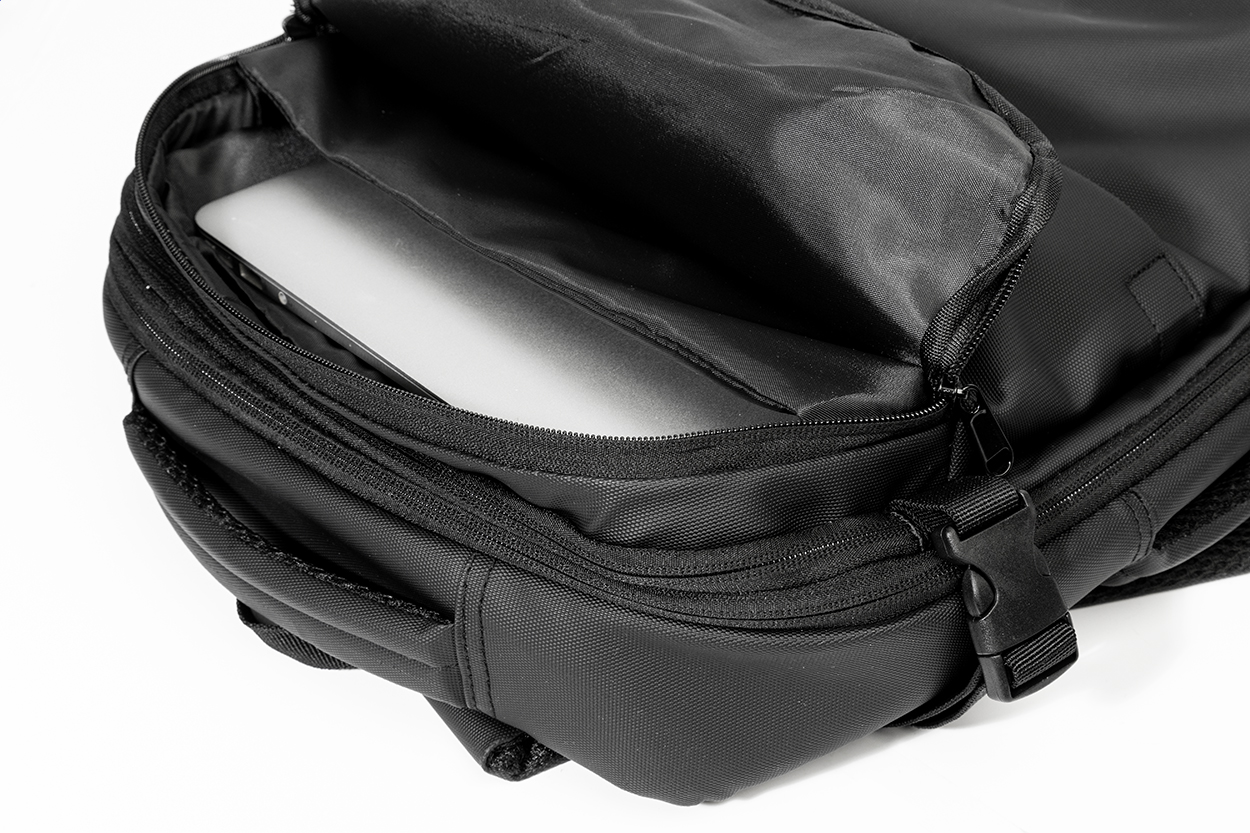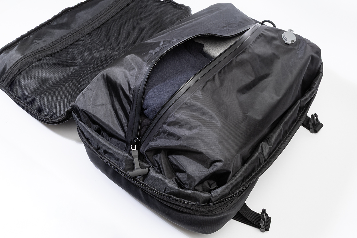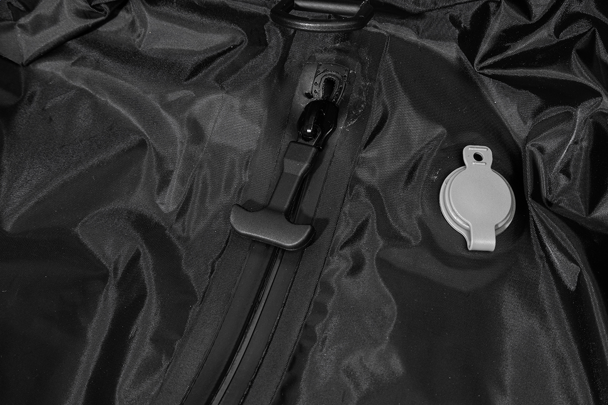 Voděodolný, roztahovací kompresní batoh s přihrádkami na zip, vestavěnou vakuovou kompresní přihrádkou, polstrovanou přihrádkou na notebook (15") a přední kapsou na zip. S bočními přezkami, popruhem na kolečkách, polstrovanými zády a ramenními popruhy. vakuové pumpy s USB akumulátorem (1500 mAh).